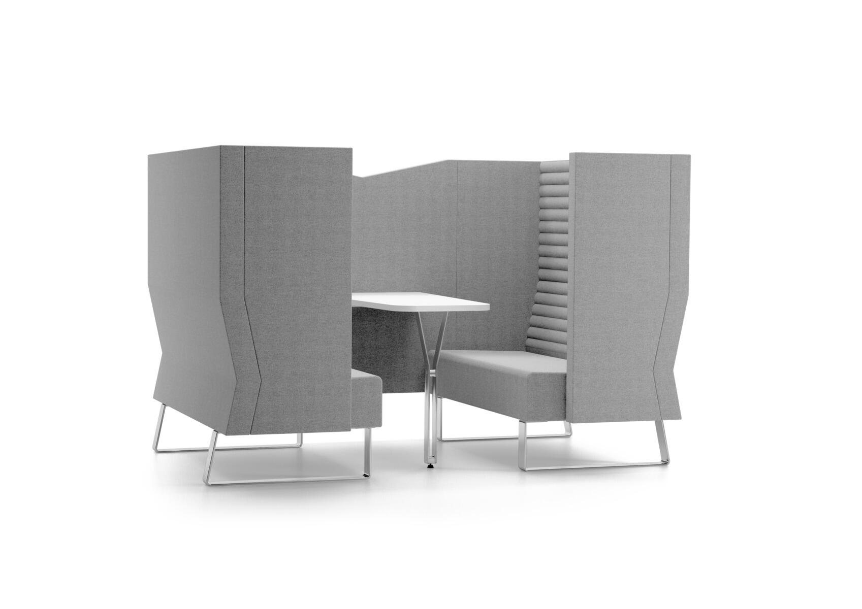 Omslutande soffa som tack vare sina höga sidor har en ljuddämpande och avskärmande effekt, vilket gör att den lämpar sig för exempelvis gruppmöten, samarbetsuppgifter eller egentid i en dämpad miljö. De höga väggarna ger avskildhet från resten av rummet. Inkl.bord med vit laminat skiva 120x60/40 cm. Trästomme och stoppning i kallskum. Medar i pulverlackad metall. Färgval på rygg och mittvägg. Gavlar och sits alltid grå kulör i det tyg som väljs. Som tillval finns eluttag i bordsskivan.