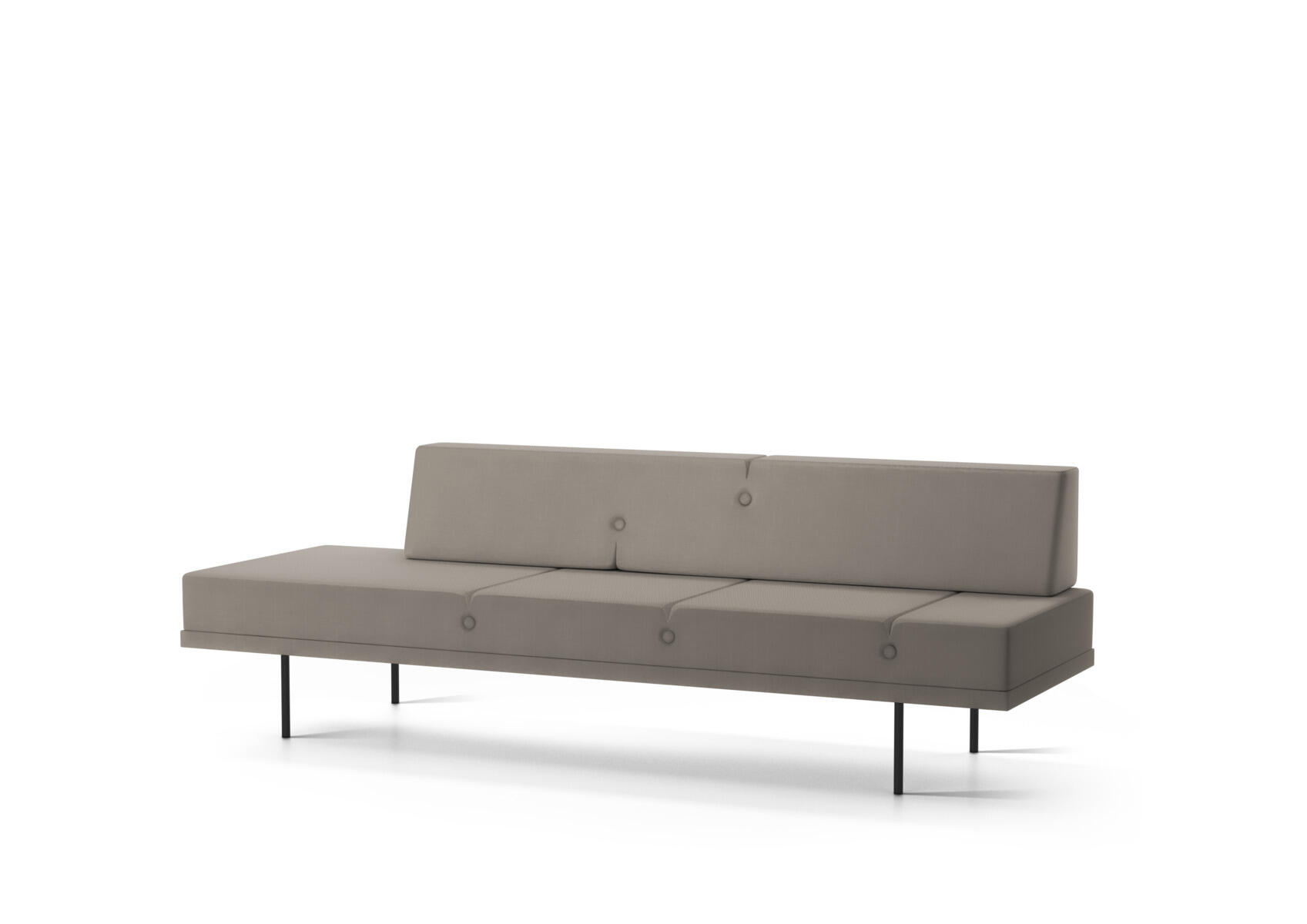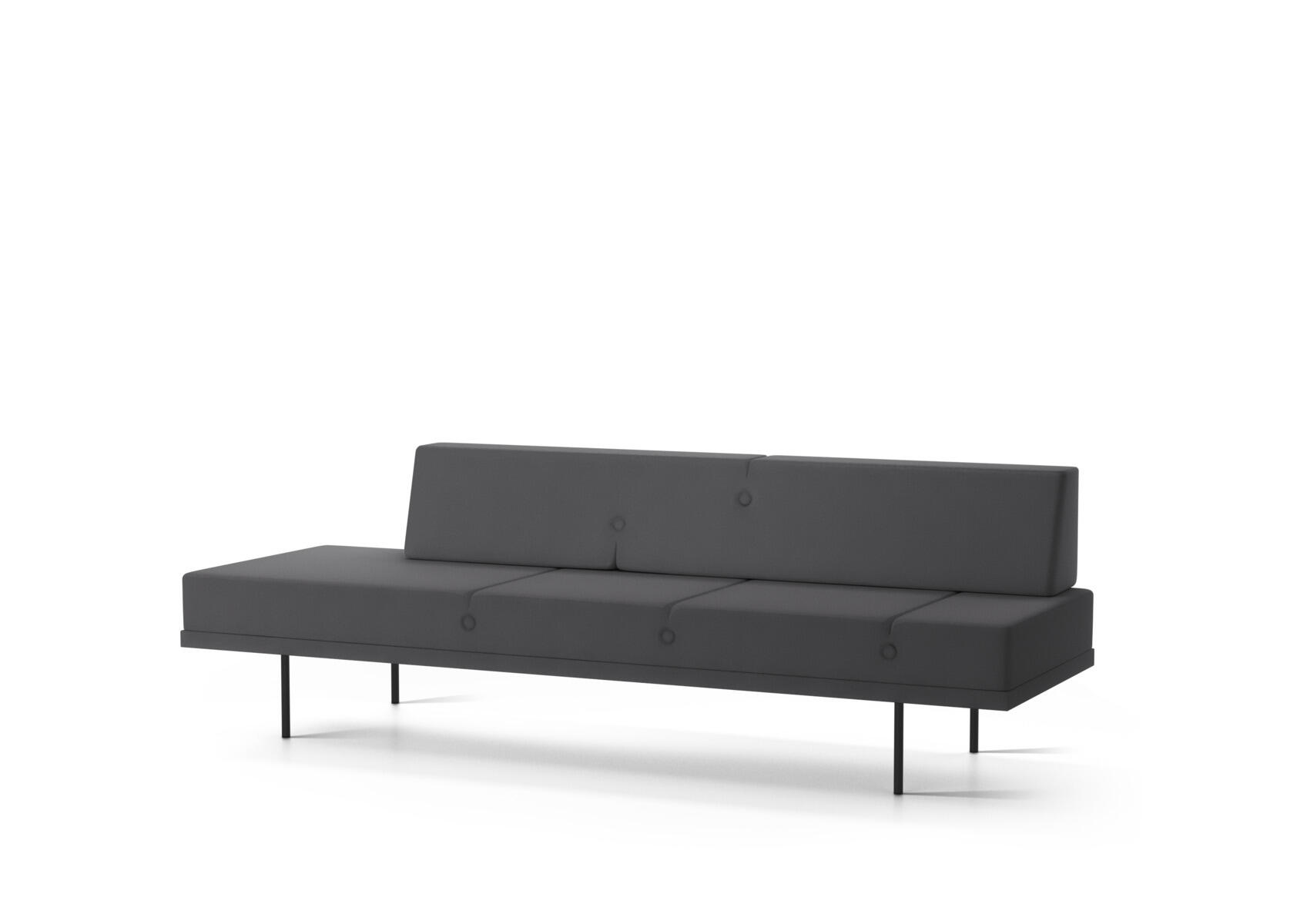 Soffmodul med en modern, stilren och rak design. Kombinera modulerna efter era specifika behov. Smulspringan mellan rygg och sits (3 cm) gör det enkelt att hålla rent. Trästomme och stoppning i kallskum. Medar i pulverlackad metall. Köp till kopplingsbeslag artnr 110323.