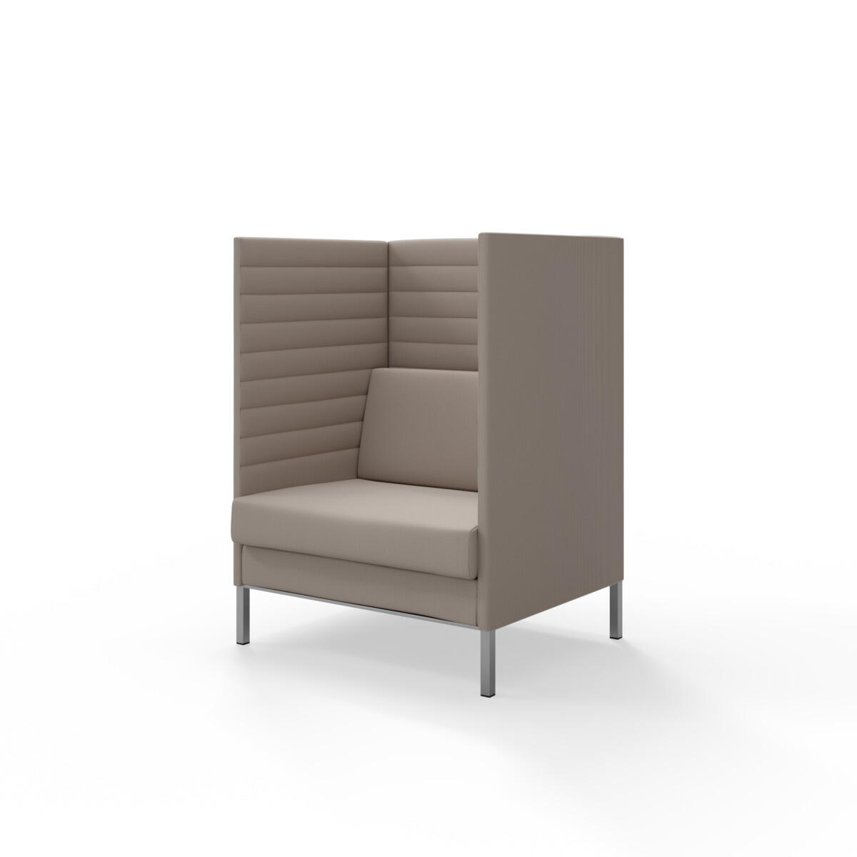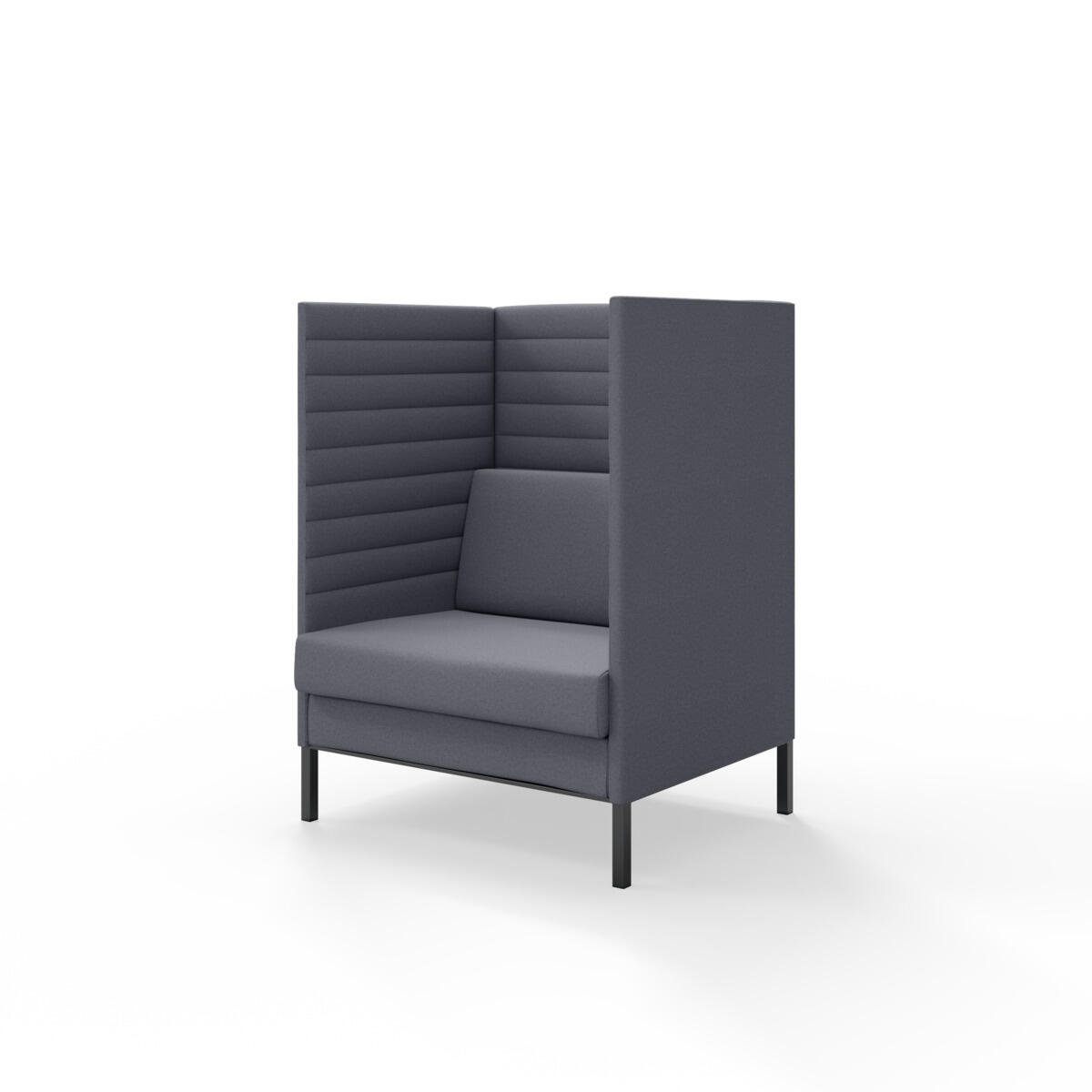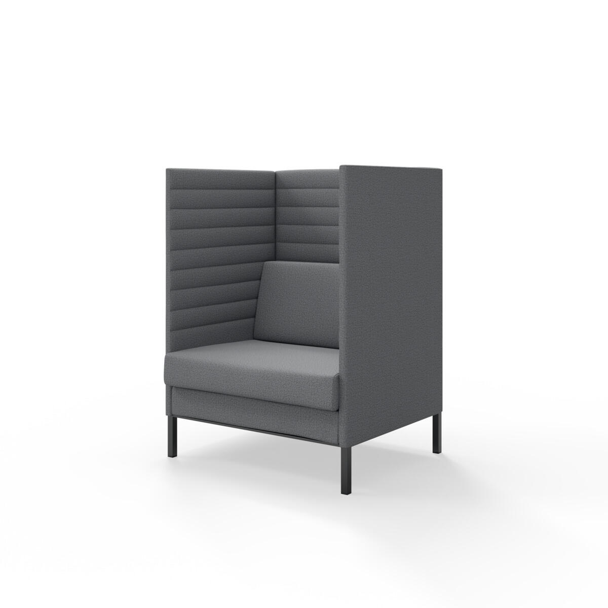 Den höga ryggen och de höga gavlarna skärmar av och dämpar ljud effektivt. Trästomme med nozagbotten och stoppning i kallskum. Stativ i pulverlackad metall. Avtagbart fodral på rygg- och sittdyna. Rygg och sits ljusgrå, färgval för paneler.