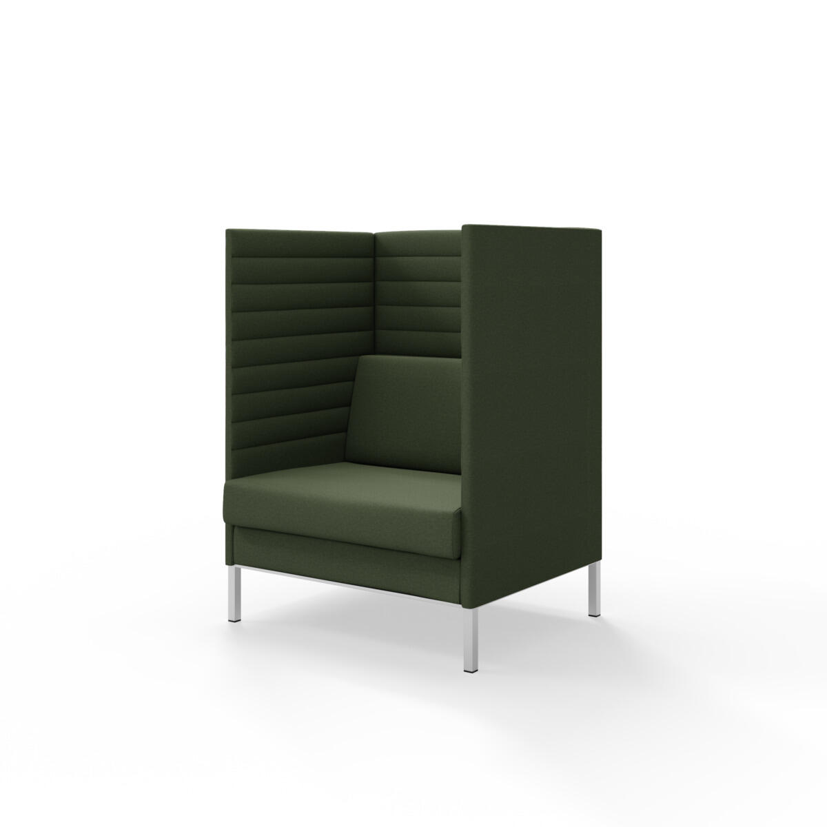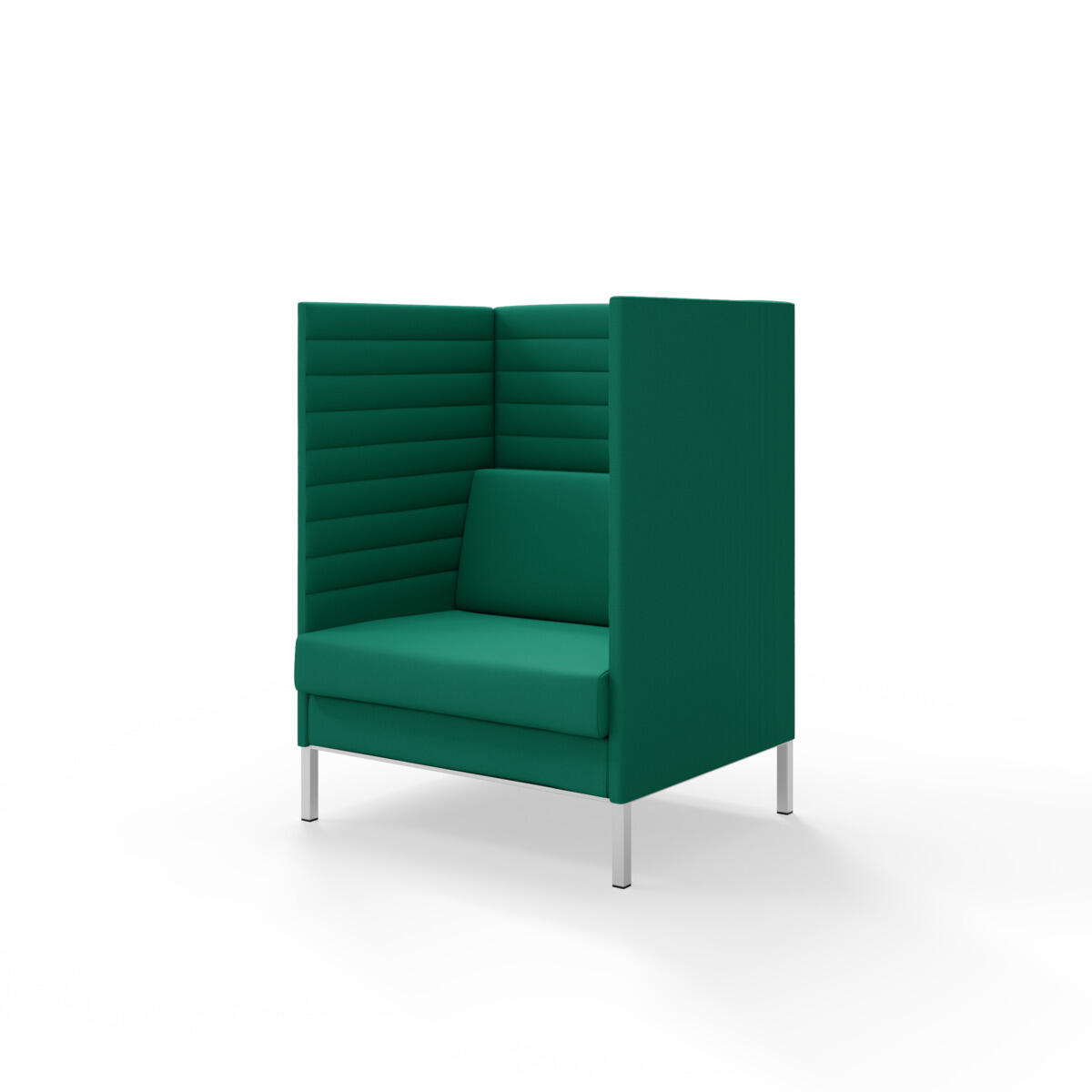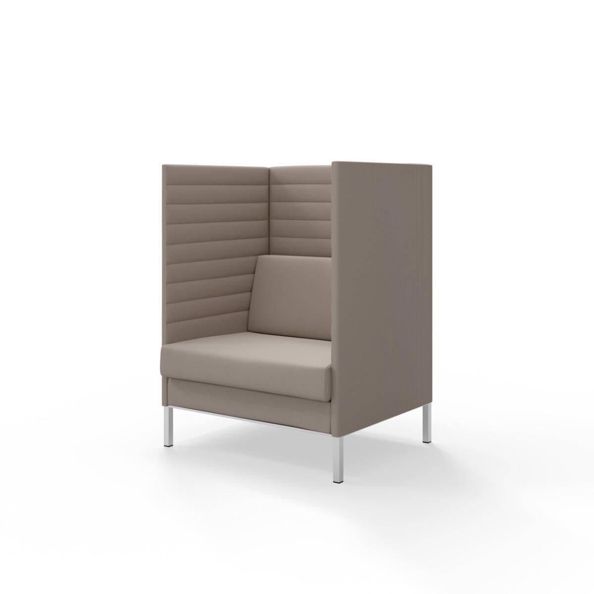 Den höga ryggen och de höga gavlarna skärmar av och dämpar ljud effektivt. Trästomme med nozagbotten och stoppning i kallskum. Stativ i pulverlackad metall. Avtagbart fodral på rygg- och sittdyna. Rygg och sits ljusgrå, färgval för paneler.