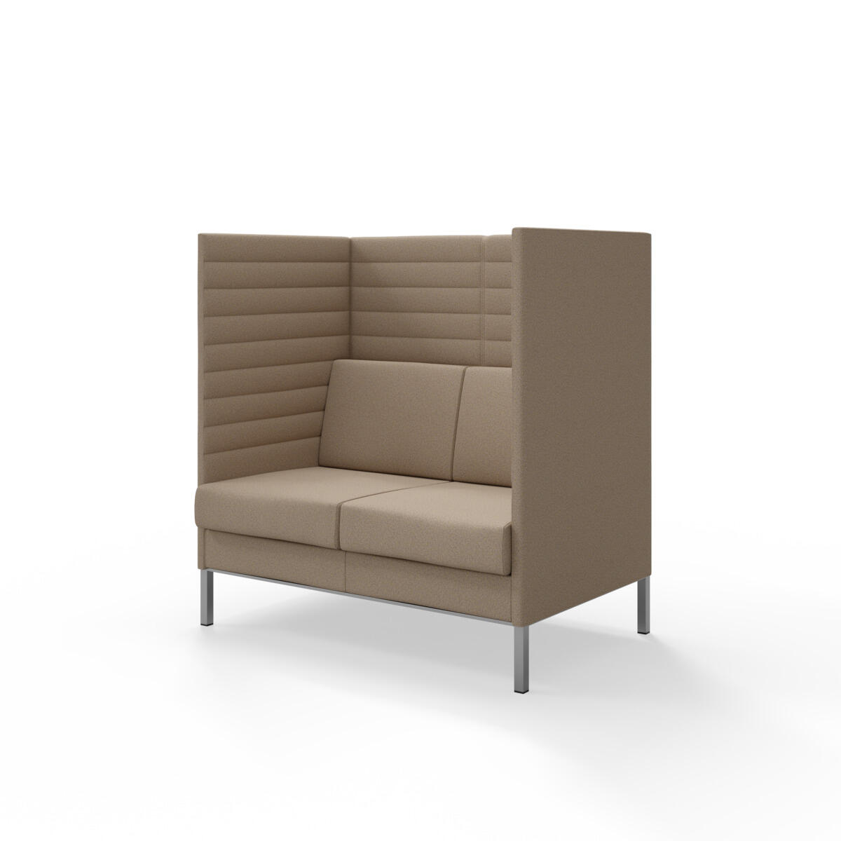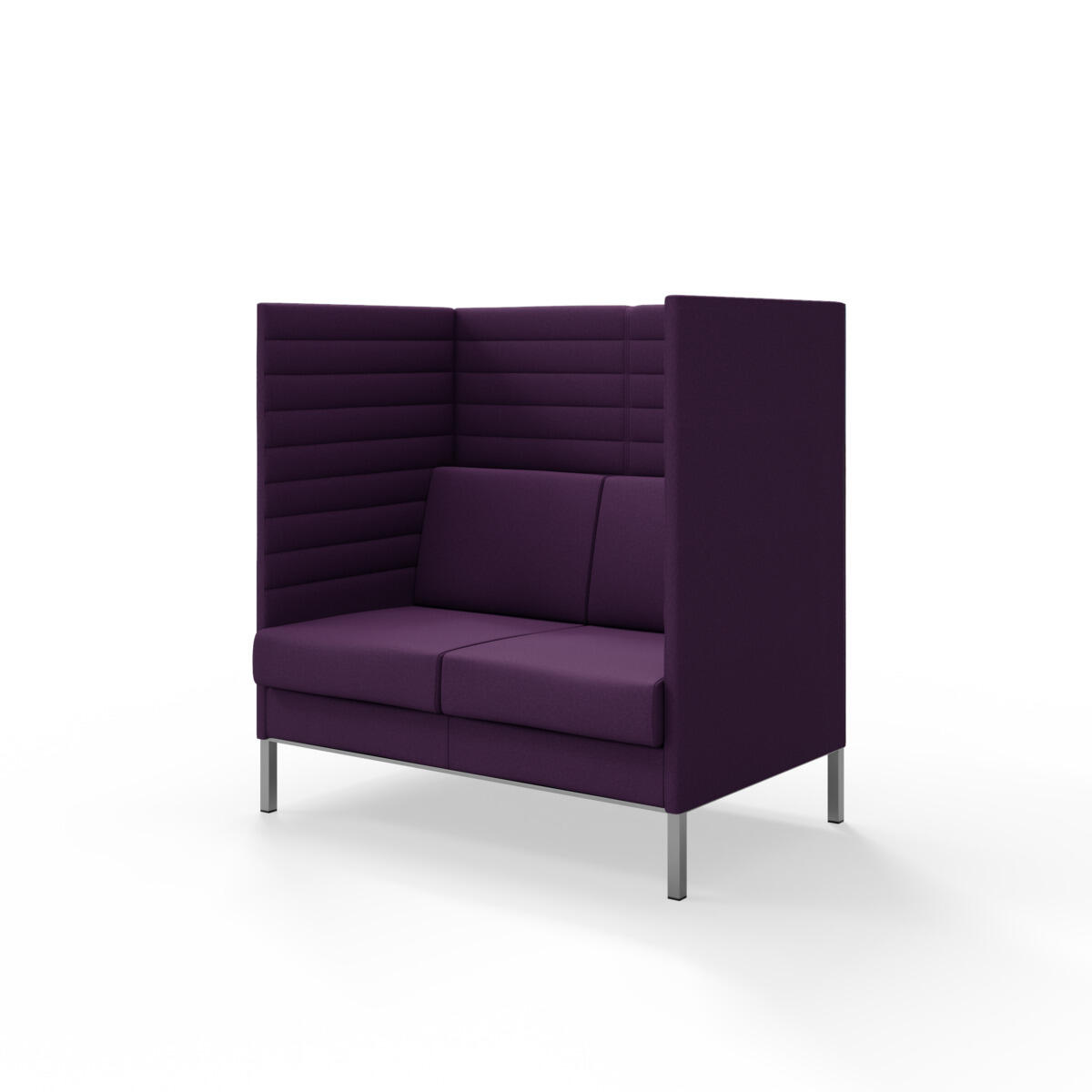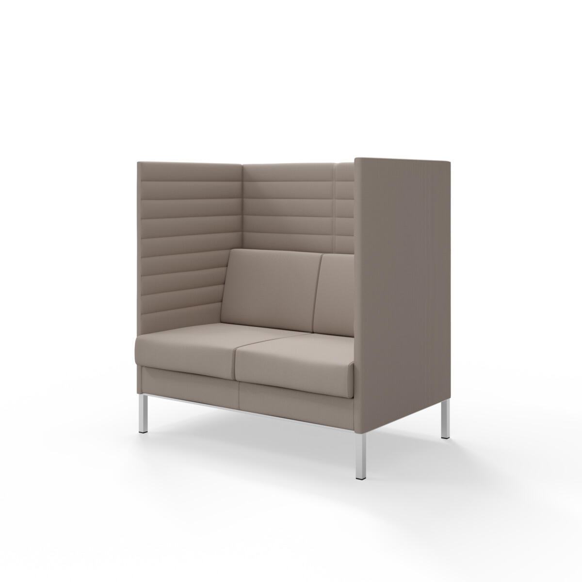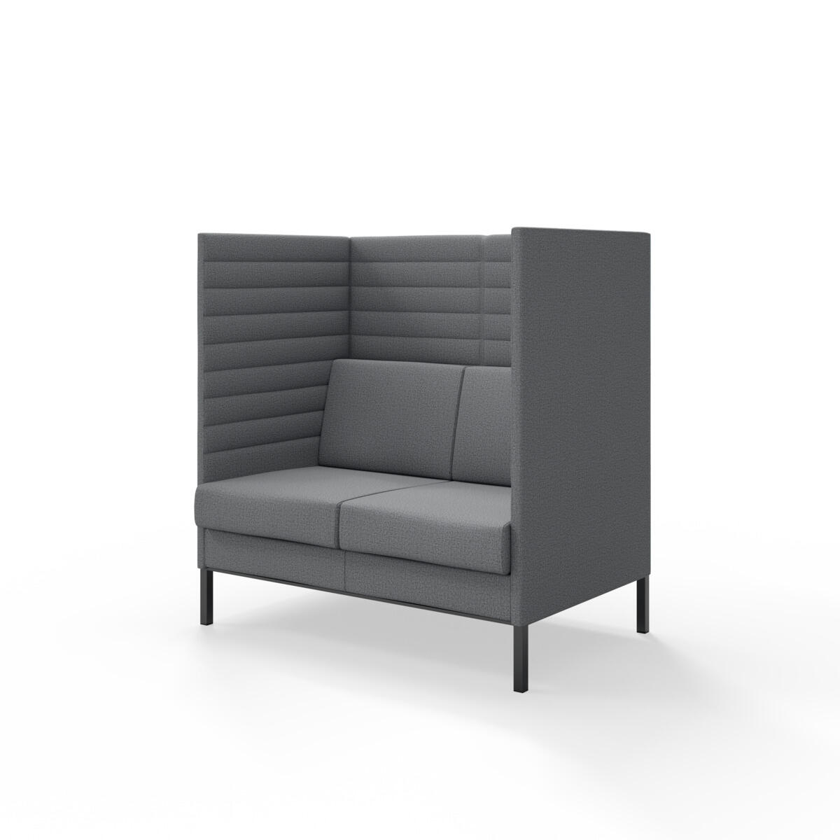 Den höga ryggen och de höga gavlarna skärmar av och dämpar ljud effektivt. Trästomme med nozagbotten och stoppning i kallskum. Stativ i pulverlackad metall. Avtagbart fodral på rygg- och sittdyna. Rygg och sits ljusgrå, färgval för paneler.