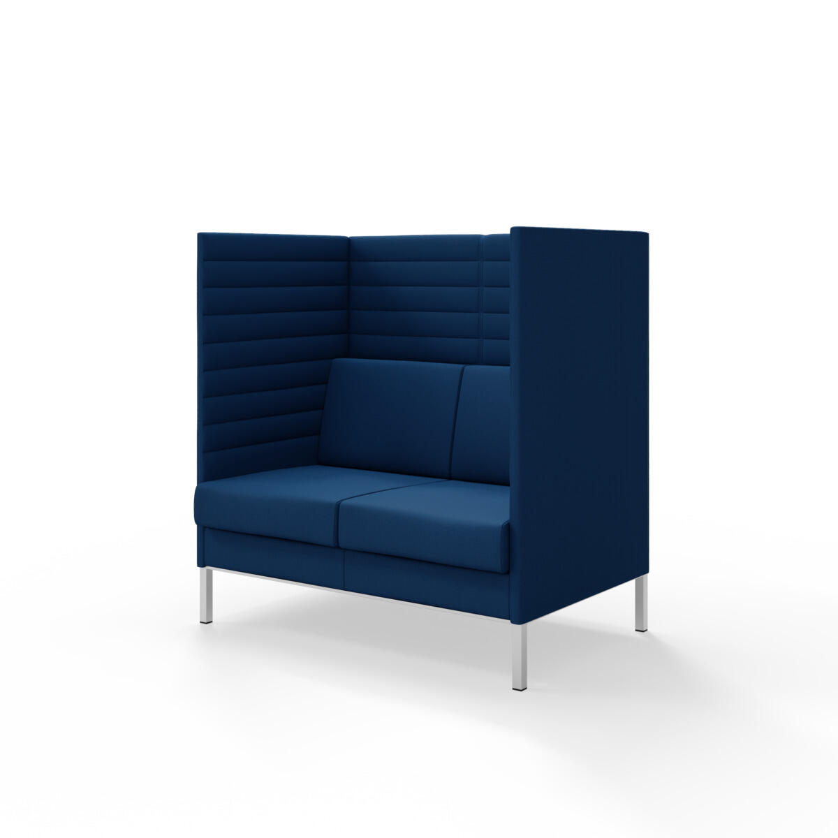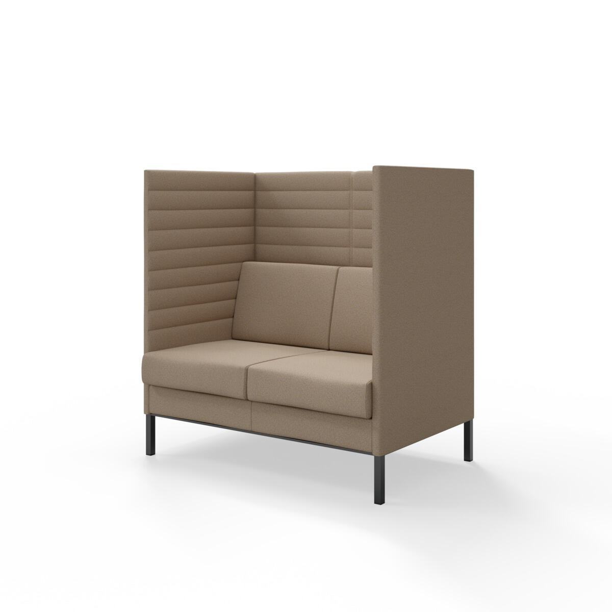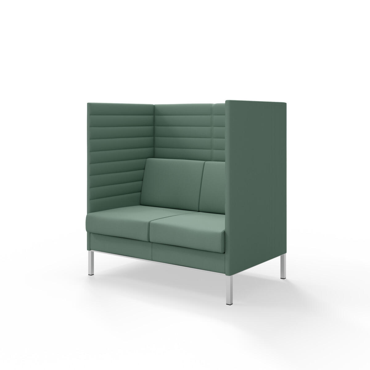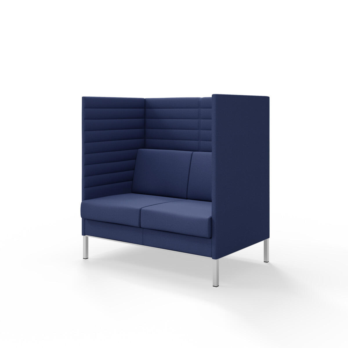 Den höga ryggen och de höga gavlarna skärmar av och dämpar ljud effektivt. Trästomme med nozagbotten och stoppning i kallskum. Stativ i pulverlackad metall. Avtagbart fodral på rygg- och sittdyna. Rygg och sits ljusgrå, färgval för paneler.