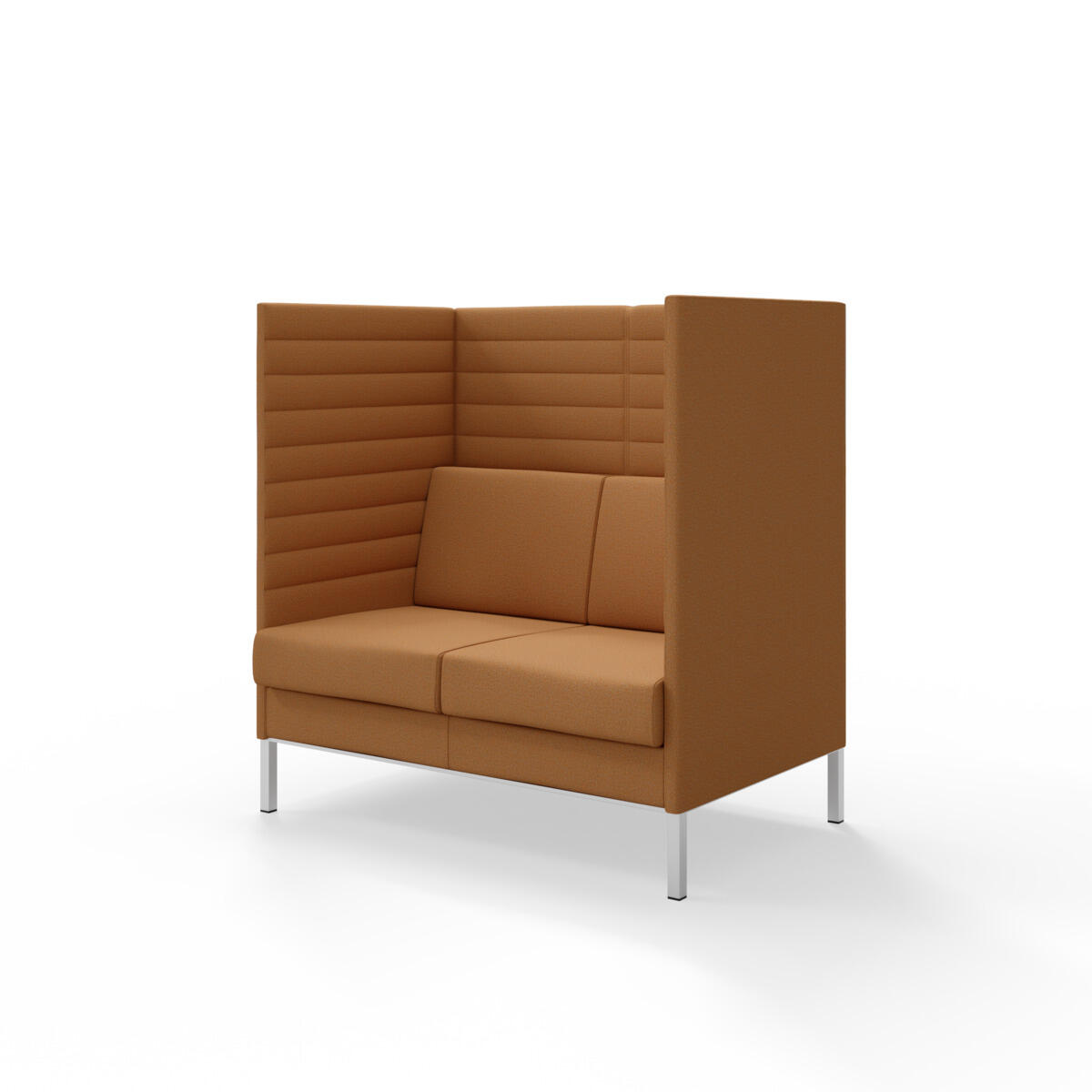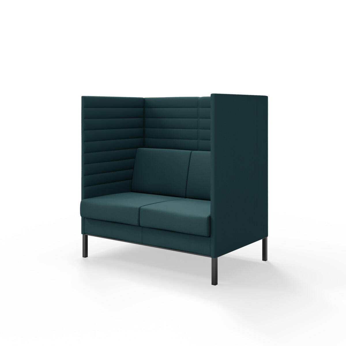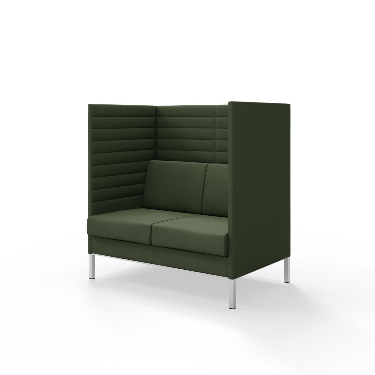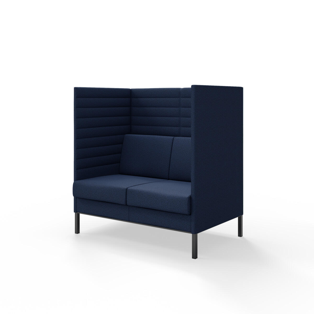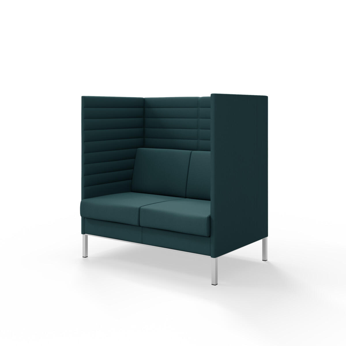 Den höga ryggen och de höga gavlarna skärmar av och dämpar ljud effektivt. Trästomme med nozagbotten och stoppning i kallskum. Stativ i pulverlackad metall. Avtagbart fodral på rygg- och sittdyna. Rygg och sits ljusgrå, färgval för paneler.