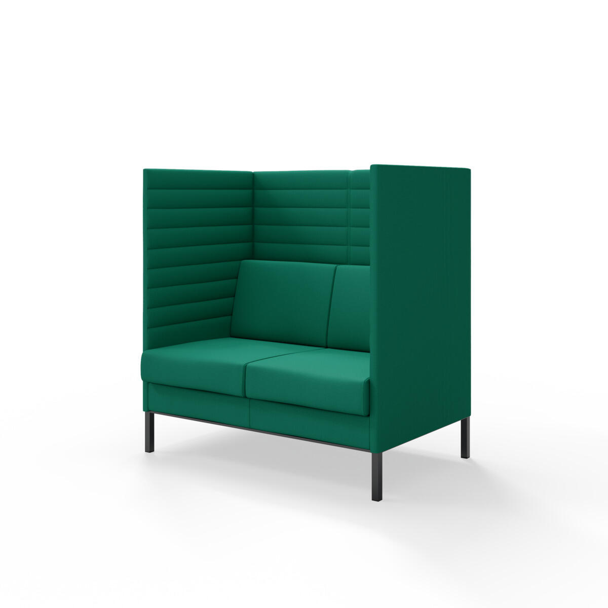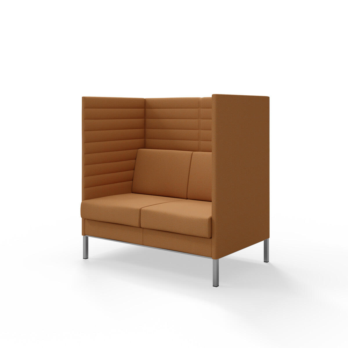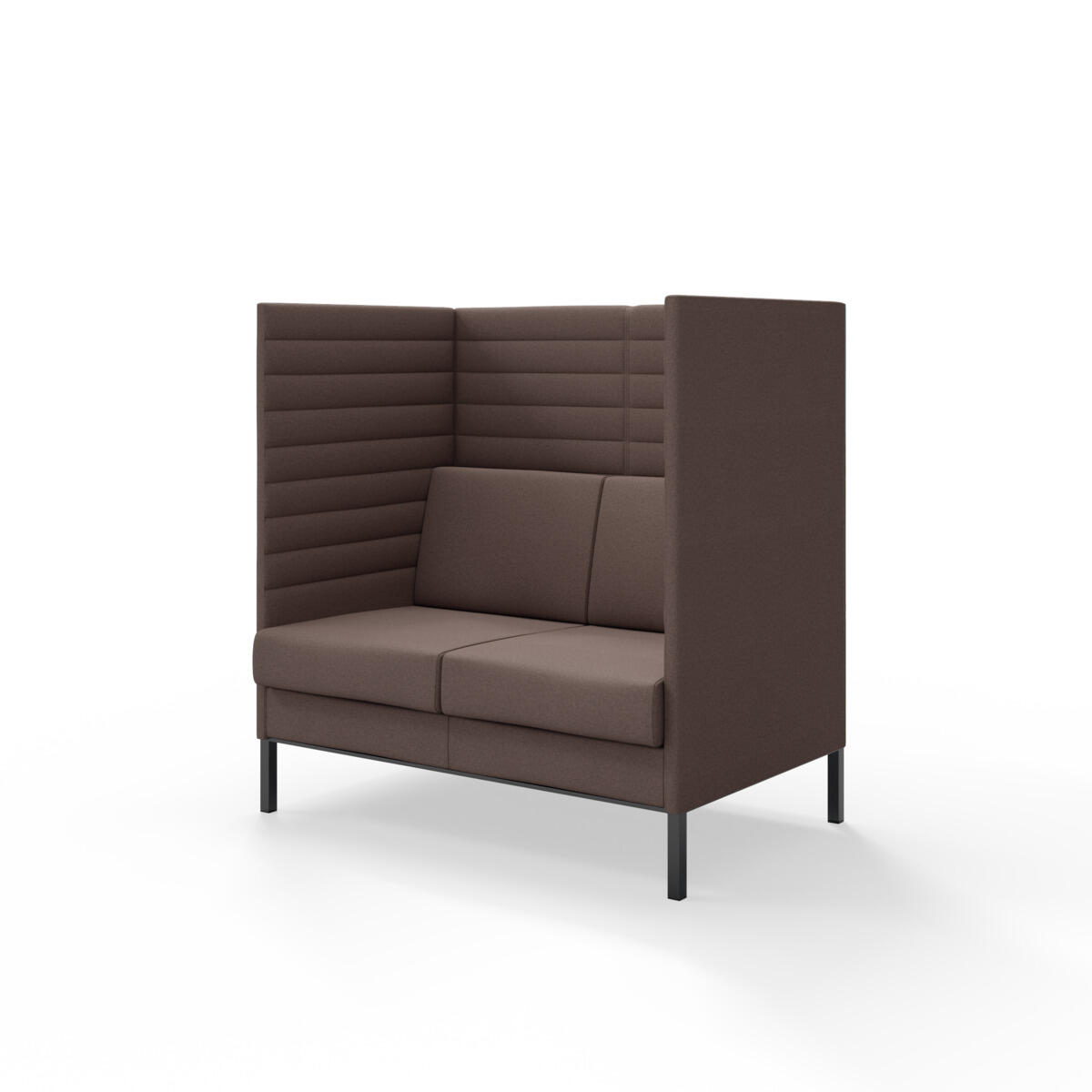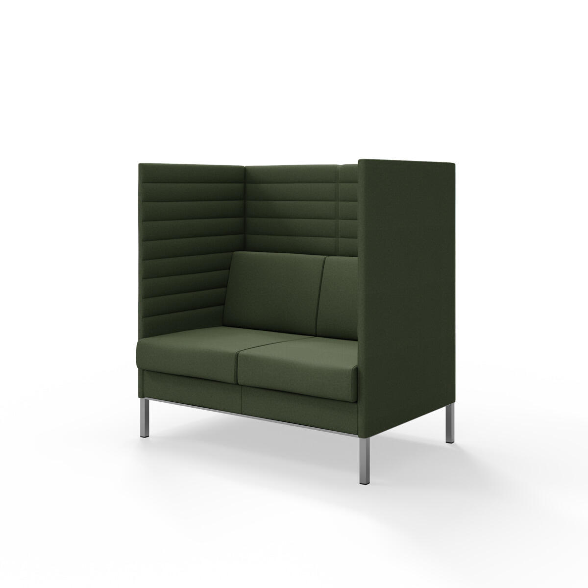 Den höga ryggen och de höga gavlarna skärmar av och dämpar ljud effektivt. Trästomme med nozagbotten och stoppning i kallskum. Stativ i pulverlackad metall. Avtagbart fodral på rygg- och sittdyna. Rygg och sits ljusgrå, färgval för paneler.