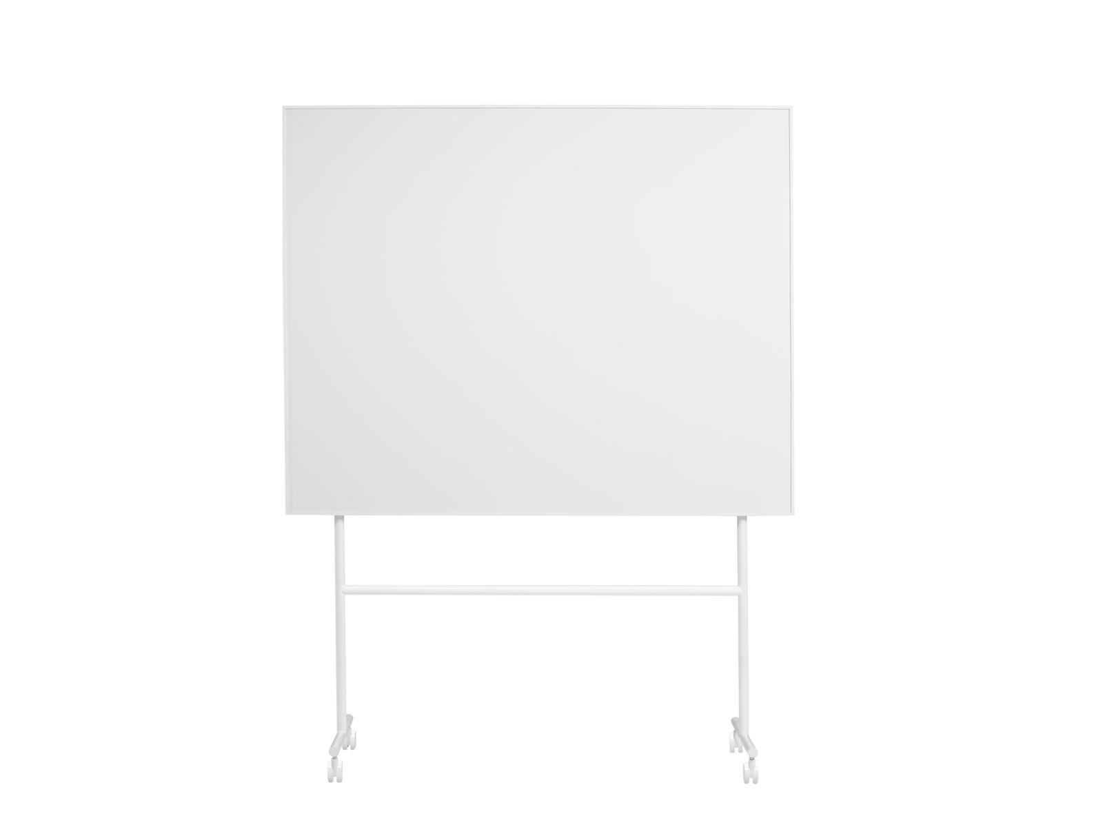 Glasemaljerad skrivyta. Vitlackerat stativ. Vit ram. Vitlackerad baksida. Fyra hjul varav två låsbara. Tavlans mått: B200xH120 cm. Totalmått: B200xD50xH196 cm.