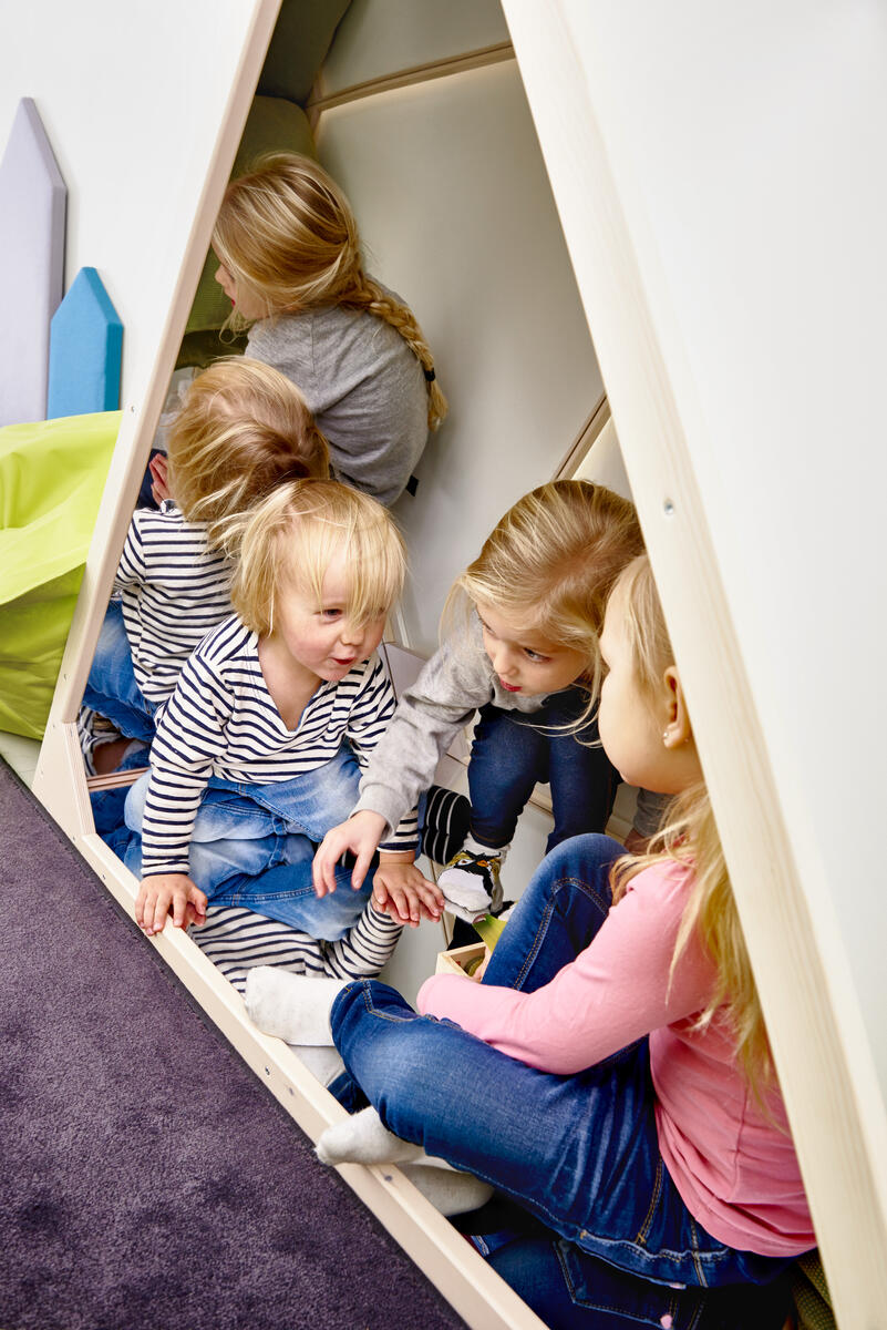 Hus i plywood som blir ett eget hus i rummet. Tre hela väggar och ett tak med hål; i hålen passar t.ex. en boll av storlek tennisboll, ärtpåse eller liknande. Hemma Hus stort passar utanpå och litet passar inuti. Man kan sitta i lugn och ro i egna tankar – avskilt men ändå i rummet. Klarlackat. Mått: B87xD87xH100 cm.