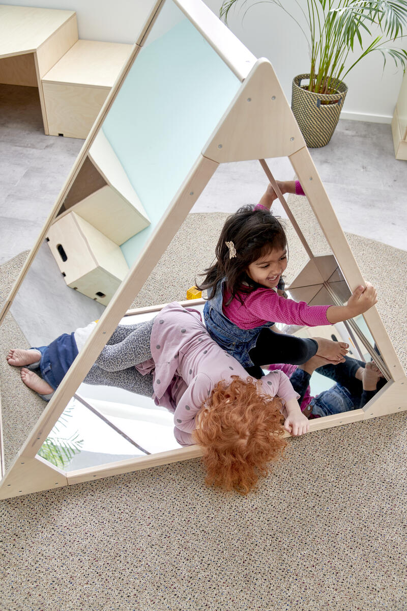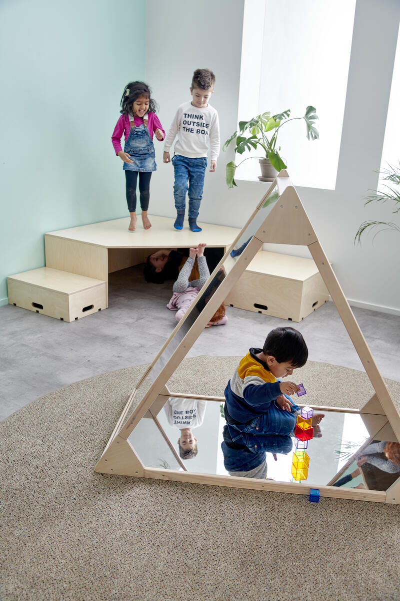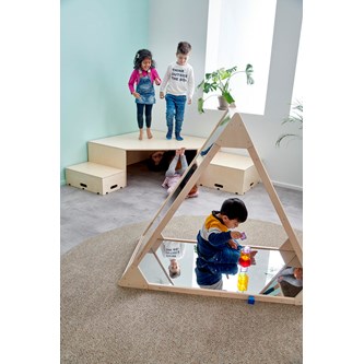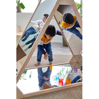 Ett roligt spegelhus som uppfattas större på insidan än på utsidan. Sittsäck ingår ej. Tillverkat i björkkryssfaner och aluminiumfolie. Mått: L105xB105xH92, mått på hålet B76xH65.