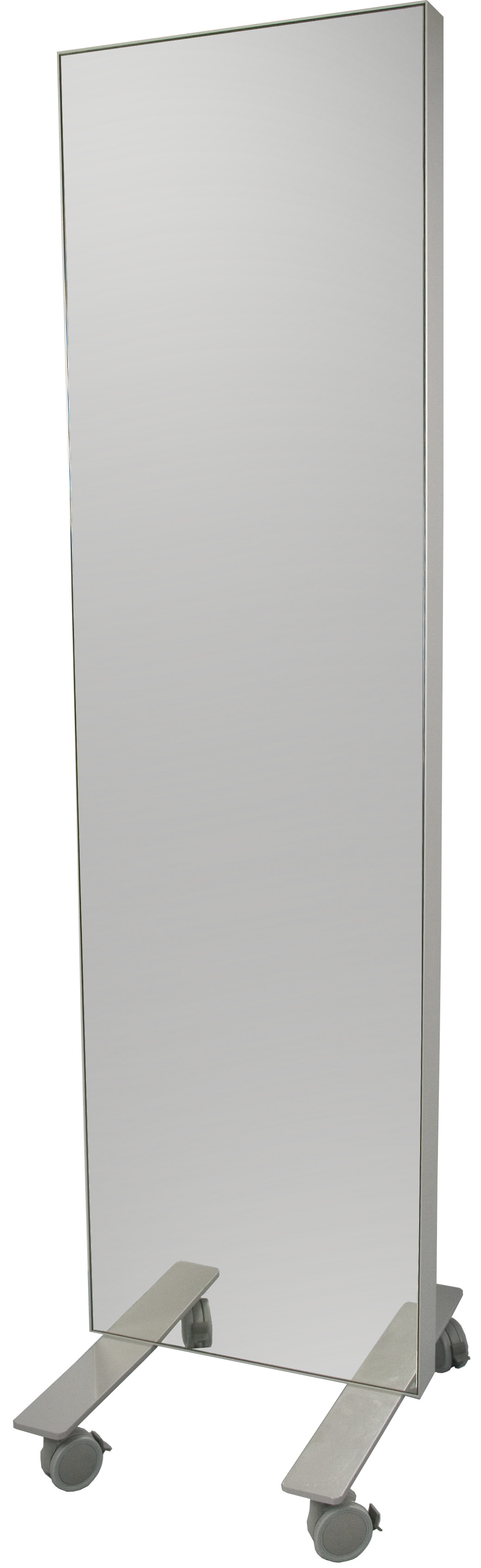 En fristående dubbelsidig säkerhetsfolierad spegel. Spegelmått: 180x50 cm. Ram i aluminium. Foten är i pulverlackat stål med hjul.