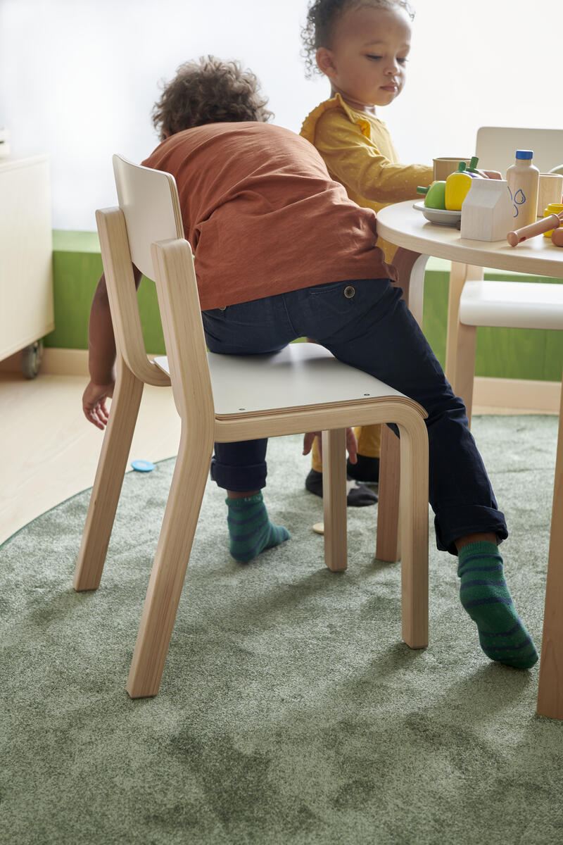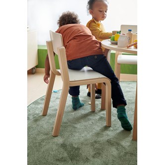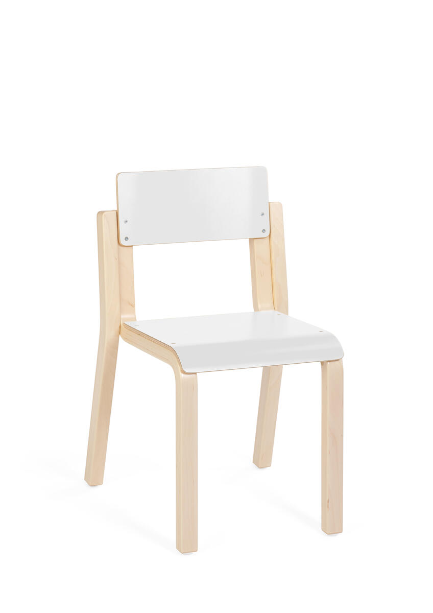 Färgkoordinerad med vårt övriga sortiment. Stativet är i vitpigmenterad björk och sits och rygg är i tåligt högtryckslaminat. Stolen är även försedd med tysta glidtassar för en lugnare miljö. Använd gärna vårt upphängningsbeslag för att underlätta städning. Sits: B34 D28 cm.