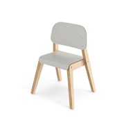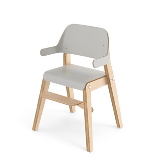Grow har en cirkulär design där alla delar kan bytas ut, vilket ger en lång livstid. Benramen är av klarlackad björkplywood, och sits och rygg är av plywood med tåligt högtryckslaminat. Ryggstödet med armstöd är mjukt skålat för att ge barnet extra komfort och stöd. Den lätt bakåtlutade sitsen med sin rundade framkant ger en mjuk känsla och förebygger att barnet glider ner. Sitsen har inga skruvhål i ytskiktet vilket gör den enkel att torka av och hålla ren. Stolens sittdjup och sitthöjd är anpassade för barn 115-120 cm. Stapelbar upp till tre i höjd. Stolen uppfyller de höga kraven enligt standard EN 17191.