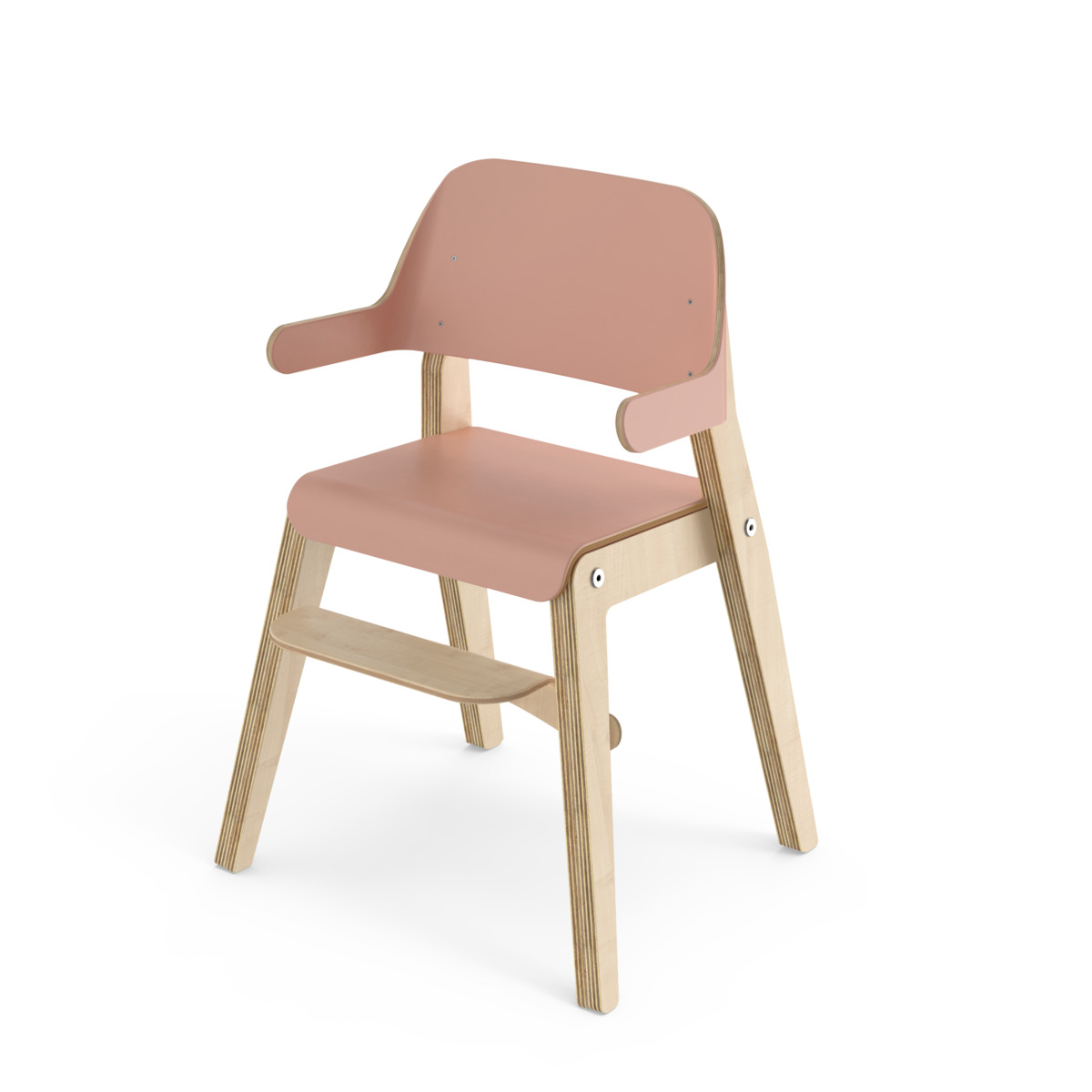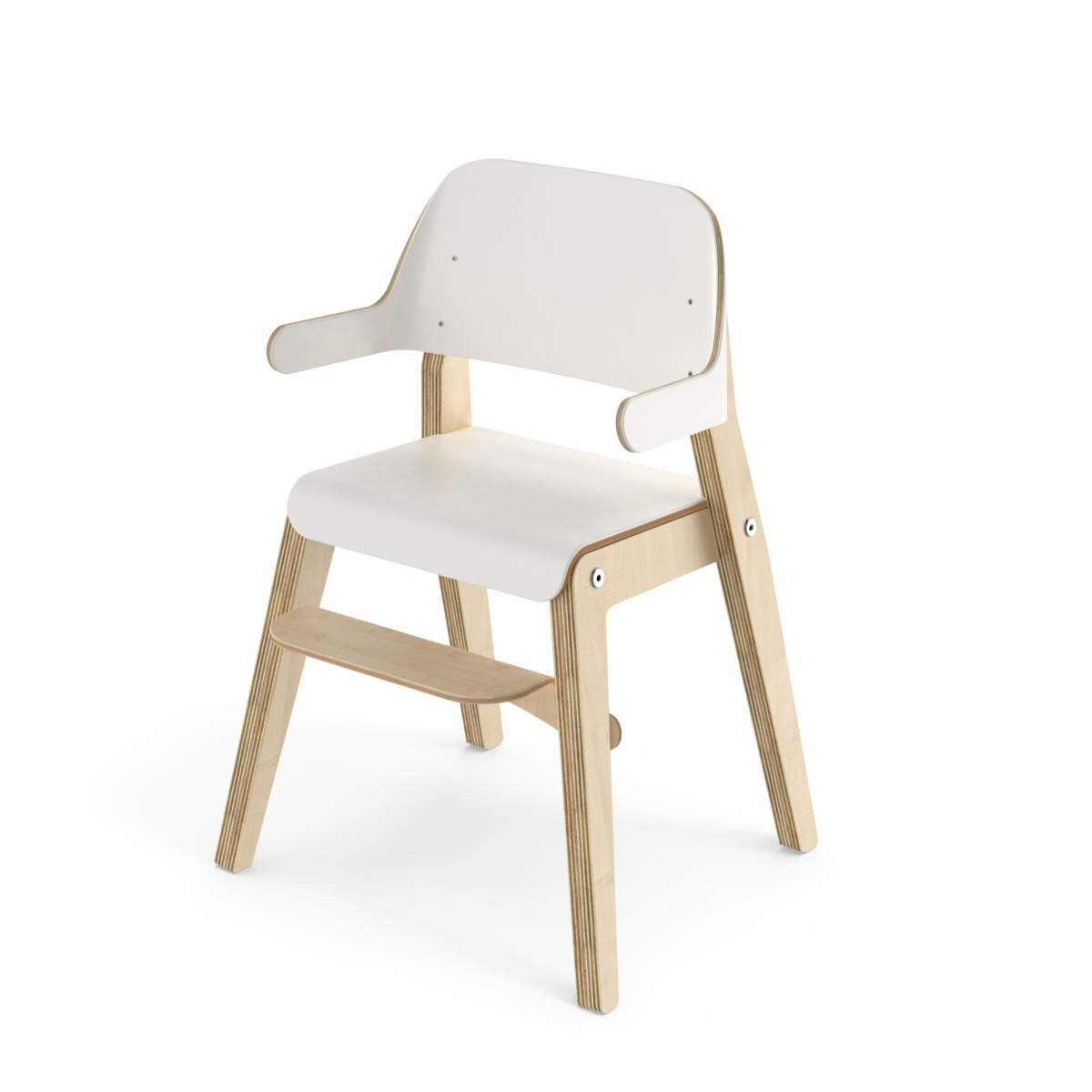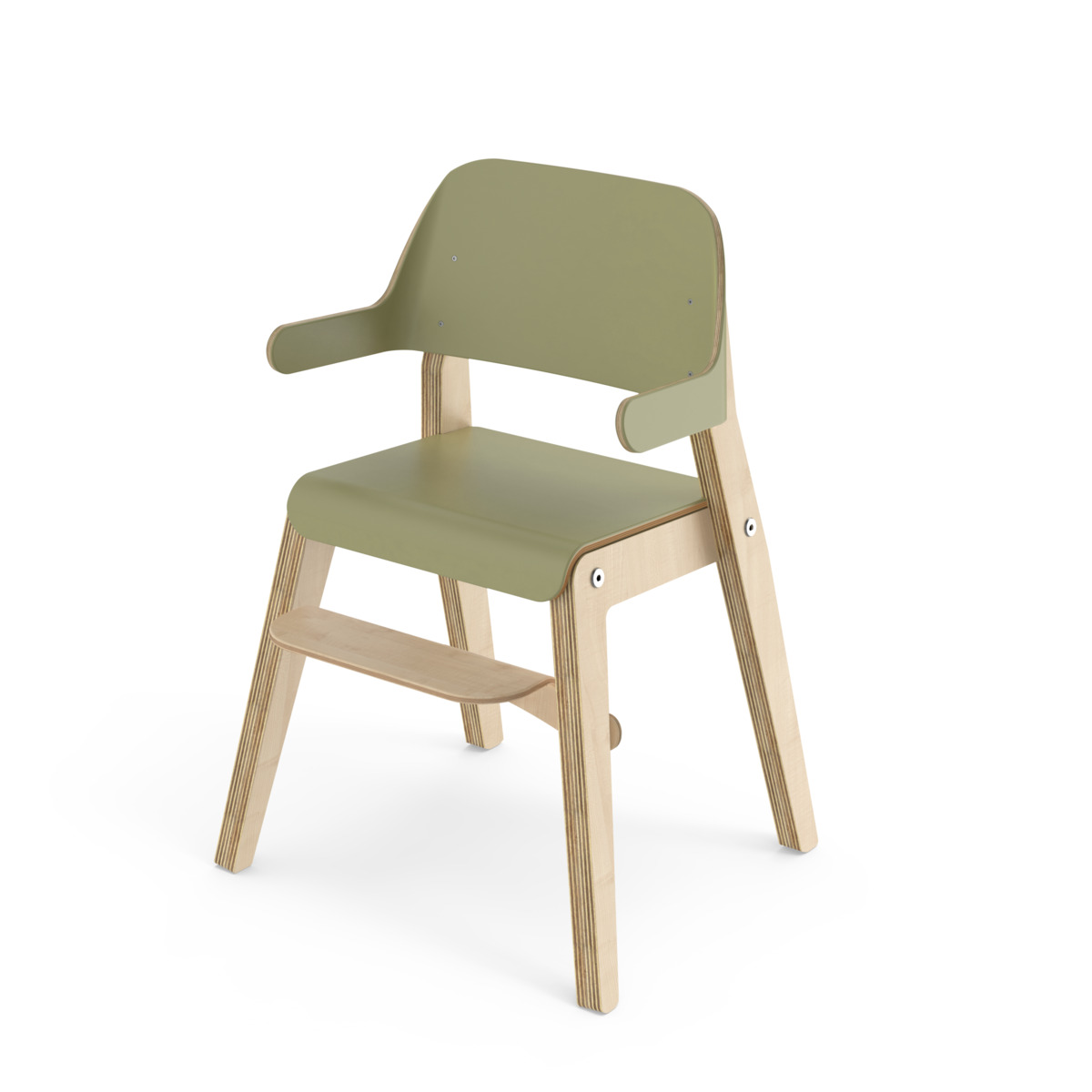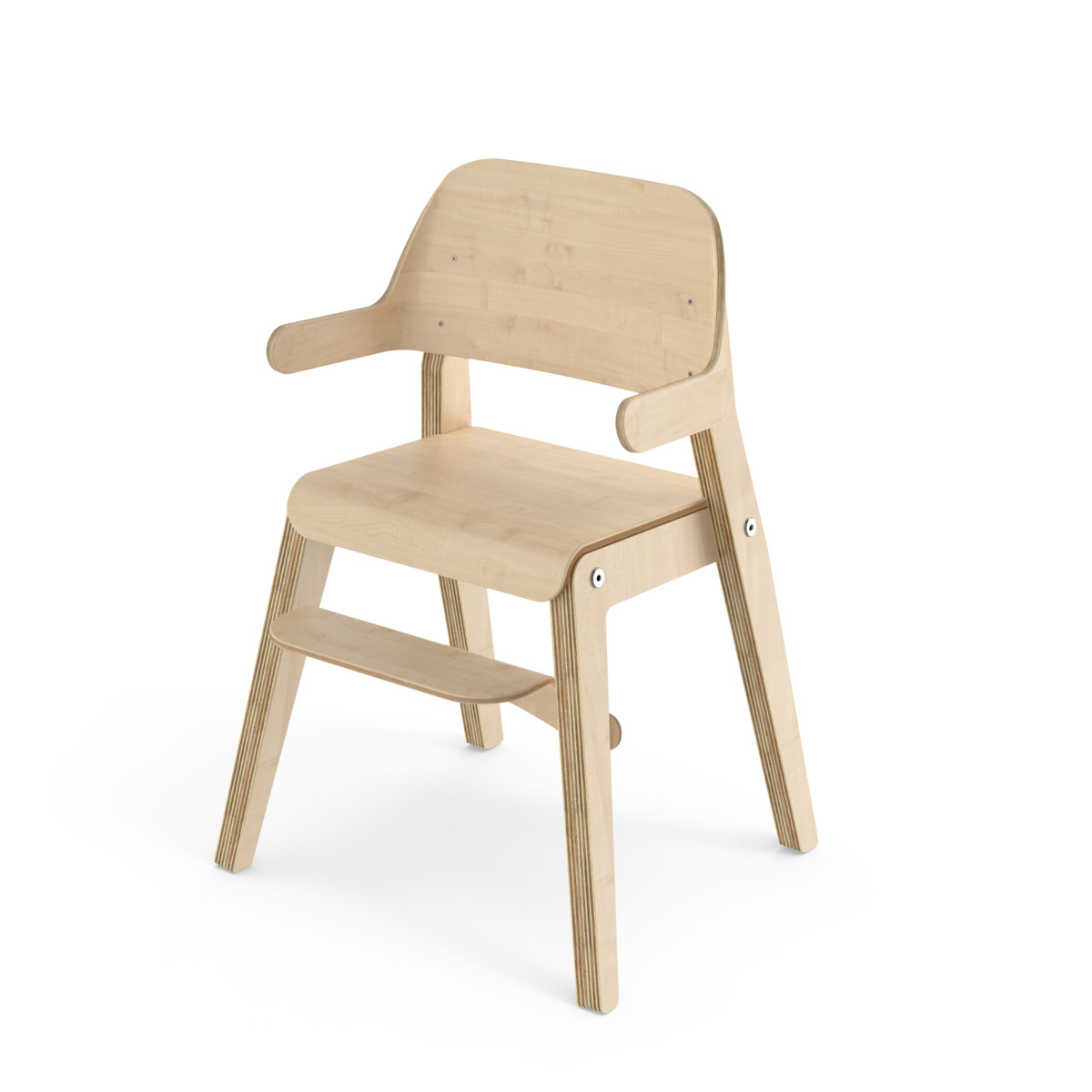 Grow har en cirkulär design där alla delar kan bytas ut, vilket ger en lång livstid. Benramen är av klarlackad björkplywood, och sits och rygg är av plywood med tåligt högtryckslaminat. Ryggstödet med armstöd är mjukt skålat för att ge barnet extra komfort och stöd. Den lätt bakåtlutade sitsen med sin rundade framkant ger en mjuk känsla och förebygger att barnet glider ner. Sitsen har inga skruvhål i ytskiktet vilket gör den enkel att torka av och hålla ren. Stolens sittdjup och sitthöjd är anpassade för barn 80-120 cm. Fotstödet går att justera i fyra sitthöjder 15-30 cm, intervall om 5 cm. Stapelbar upp till tre i höjd. Stolen uppfyller de höga kraven enligt standard EN 17191.