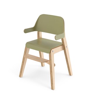Grow har en cirkulär design där alla delar kan bytas ut, vilket ger en lång livstid. Benramen är av klarlackad björkplywood, och sits och rygg är av plywood med tåligt högtryckslaminat. Ryggstödet med armstöd är mjukt skålat för att ge barnet extra komfort och stöd. Den lätt bakåtlutade sitsen med sin rundade framkant ger en mjuk känsla och förebygger att barnet glider ner. Sitsen har inga skruvhål i ytskiktet vilket gör den enkel att torka av och hålla ren. Stolens sittdjup och sitthöjd är anpassade för barn 115-125 cm. Stapelbar upp till tre i höjd. Stolen uppfyller de höga kraven enligt standard EN 17191.
