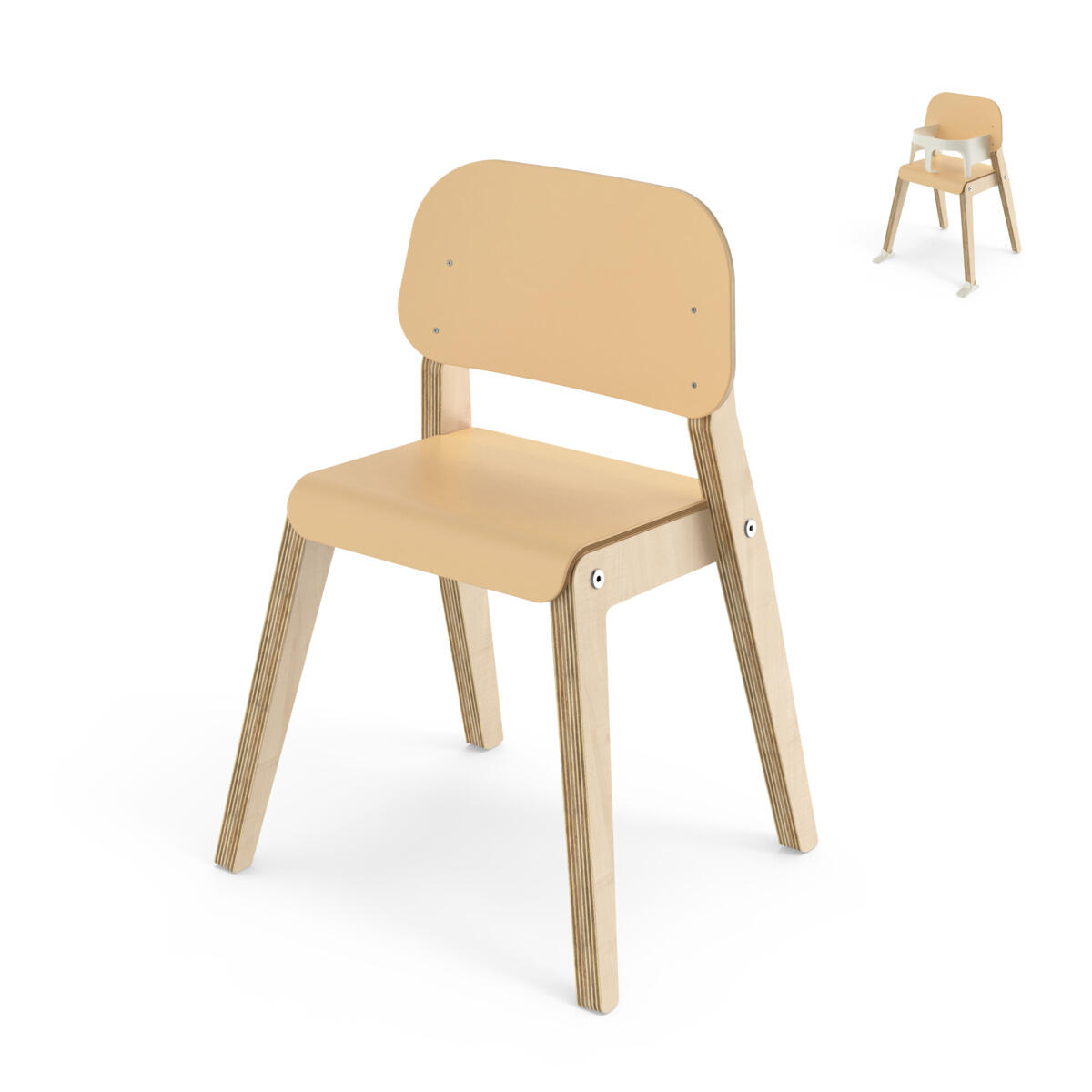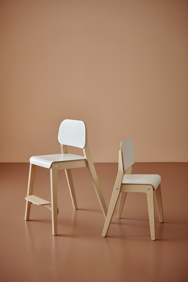 Grow har en cirkulär design där alla delar kan bytas ut, vilket ger en lång livstid. Benramen är av klarlackad björkplywood, och sits och rygg är av plywood med tåligt högtryckslaminat. Ryggstödet är mjukt skålat för att ge komfort och stöd. Den lätt bakåtlutade sitsen med sin rundade framkant ger en mjuk känsla och förebygger att barnet glider ner. Sitsen har inga skruvhål i ytskiktet vilket gör den enkel att torka av och hålla ren. Stolens sittdjup och sitthöjd är anpassade för barn 80-120 cm. Fotstödet går att justera i fyra sitthöjder 15-30 cm, intervall om 5 cm. Stapelbar upp till tre i höjd. Stolen uppfyller de höga kraven enligt standard EN 17191.