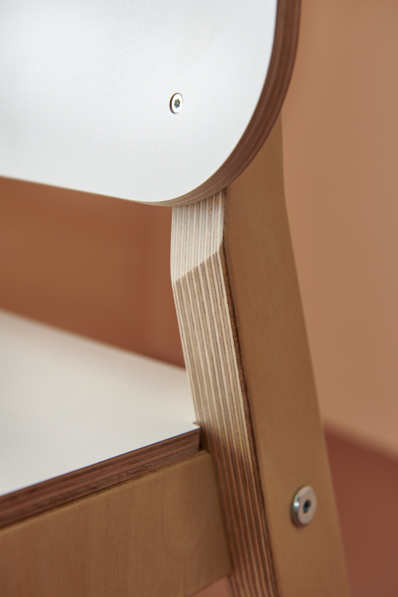 Grow har en cirkulär design där alla delar kan bytas ut, vilket ger en lång livstid. Benramen är av klarlackad björkplywood, och sits och rygg är av plywood med tåligt högtryckslaminat. Ryggstödet är mjukt skålat för att ge komfort och stöd. Den lätt bakåtlutade sitsen med sin rundade framkant ger en mjuk känsla och förebygger att barnet glider ner. Sitsen har inga skruvhål i ytskiktet vilket gör den enkel att torka av och hålla ren. Stolens sittdjup och sitthöjd är anpassade för barn 115-120 cm. Stapelbar upp till tre i höjd. Stolen uppfyller de höga kraven enligt standard EN 17191.