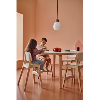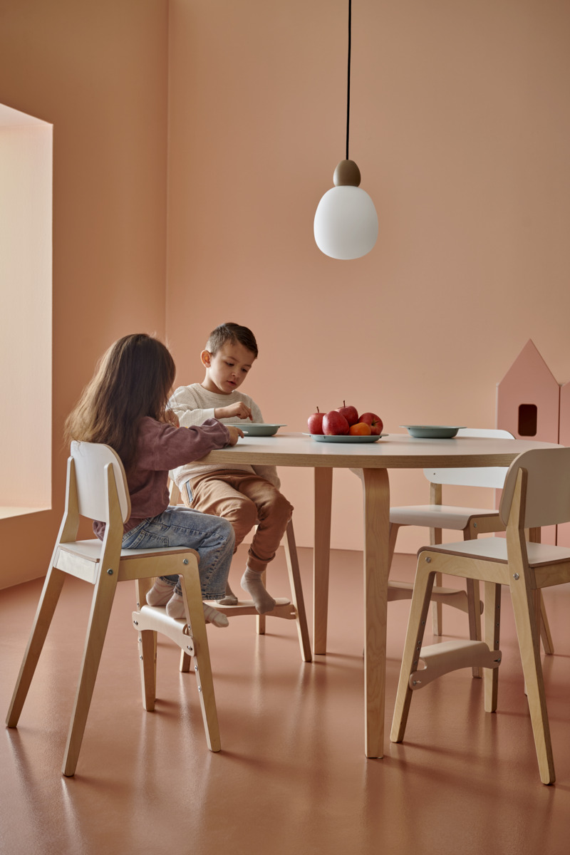 Grow har en cirkulär design där alla delar kan bytas ut, vilket ger en lång livstid. Benramen är av klarlackad björkplywood, och sits och rygg är av plywood med tåligt högtryckslaminat. Ryggstödet med armstöd är mjukt skålat för att ge barnet extra komfort och stöd. Den lätt bakåtlutade sitsen med sin rundade framkant ger en mjuk känsla och förebygger att barnet glider ner. Sitsen har inga skruvhål i ytskiktet vilket gör den enkel att torka av och hålla ren. Stolens sittdjup och sitthöjd är anpassade för barn 115-120 cm. Stapelbar upp till tre i höjd. Stolen uppfyller de höga kraven enligt standard EN 17191.