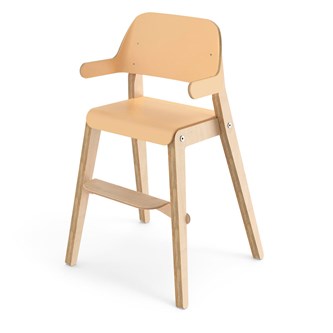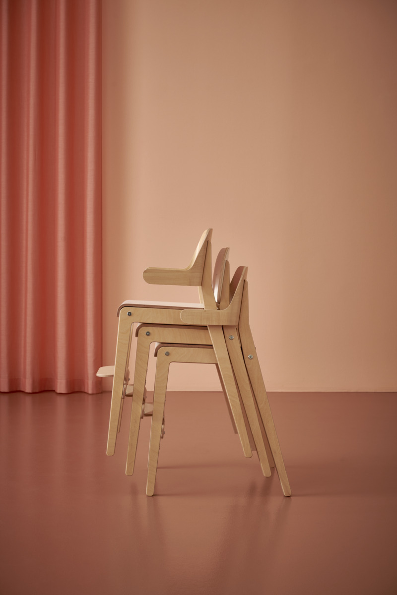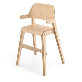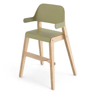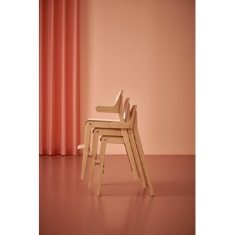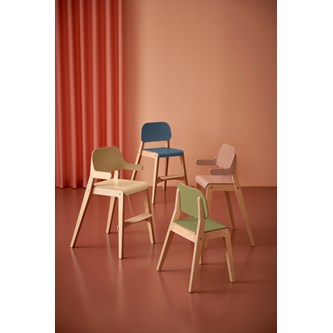 Grow har en cirkulär design där alla delar kan bytas ut, vilket ger en lång livstid. Benramen är av klarlackad björkplywood, och sits och rygg är av plywood med tåligt högtryckslaminat. Ryggstödet med armstöd är mjukt skålat för att ge barnet extra komfort och stöd. Den lätt bakåtlutade sitsen med sin rundade framkant ger en mjuk känsla och förebygger att barnet glider ner. Sitsen har inga skruvhål i ytskiktet vilket gör den enkel att torka av och hålla ren. Stolens sittdjup och sitthöjd är anpassade för barn 115-120 cm. Stapelbar upp till tre i höjd. Stolen uppfyller de höga kraven enligt standard EN 17191.