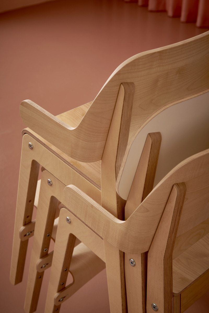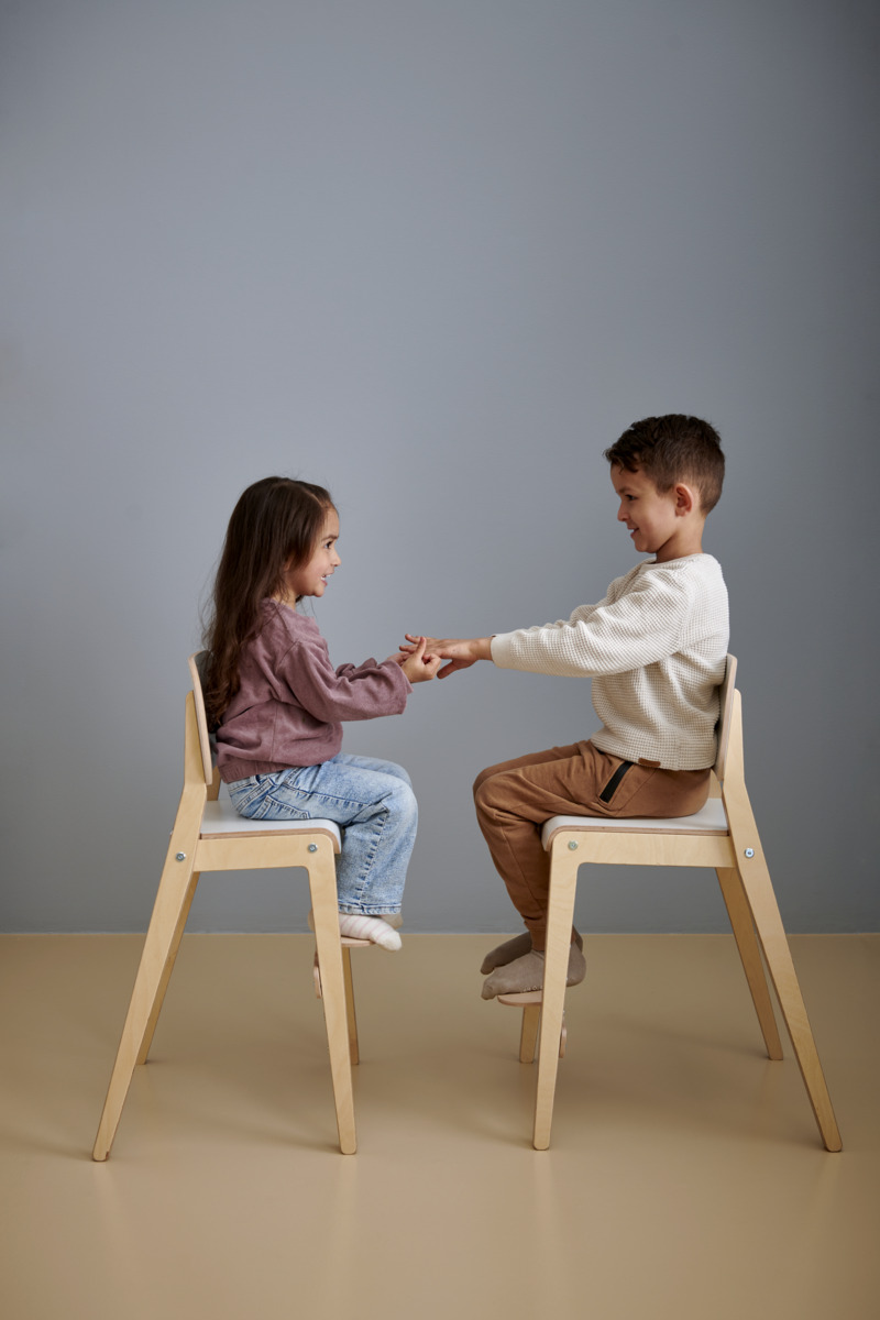 Grow har en cirkulär design där alla delar kan bytas ut, vilket ger en lång livstid. Benramen är av klarlackad björkplywood, och sits och rygg är av plywood med tåligt högtryckslaminat. Ryggstödet med armstöd är mjukt skålat för att ge barnet extra komfort och stöd. Den lätt bakåtlutade sitsen med sin rundade framkant ger en mjuk känsla och förebygger att barnet glider ner. Sitsen har inga skruvhål i ytskiktet vilket gör den enkel att torka av och hålla ren. Stolens sittdjup och sitthöjd är anpassade för barn 105-120 cm. Stapelbar upp till tre i höjd. Stolen uppfyller de höga kraven enligt standard EN 17191.