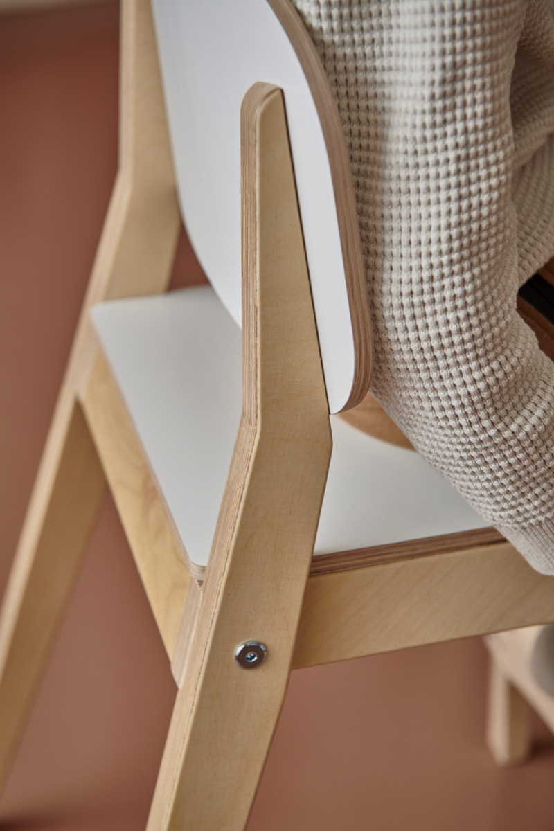 Grow har en cirkulär design där alla delar kan bytas ut, vilket ger en lång livstid. Benramen är av klarlackad björkplywood, och sits och rygg är av plywood med tåligt högtryckslaminat. Ryggstödet med armstöd är mjukt skålat för att ge barnet extra komfort och stöd. Den lätt bakåtlutade sitsen med sin rundade framkant ger en mjuk känsla och förebygger att barnet glider ner. Sitsen har inga skruvhål i ytskiktet vilket gör den enkel att torka av och hålla ren. Stolens sittdjup och sitthöjd är anpassade för barn 115-120 cm. Stapelbar upp till tre i höjd. Stolen uppfyller de höga kraven enligt standard EN 17191.