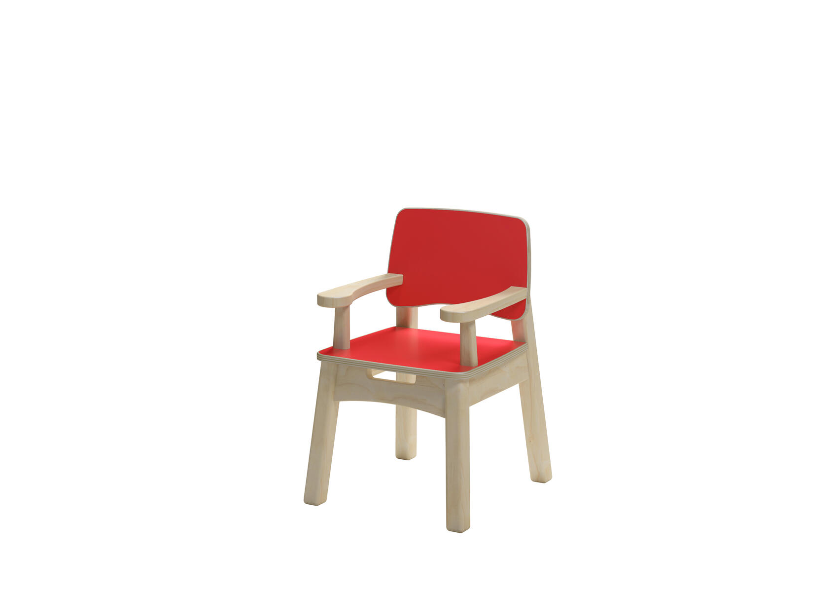 Färgkoordinerad med vårt övriga sortiment. Stativet är i vitpigmenterad björk och sits och rygg är i tåligt högtryckslaminat. Stolen är även försedd med tysta glidtassar för en lugnare miljö. Sits: B34 D28 cm. Höjd från golv till armstöd 52 cm.