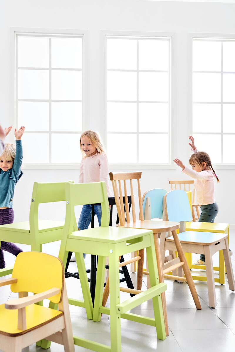 Färgkoordinerad med vårt övriga sortiment. Stativet är i vitpigmenterad björk och sits och rygg är i tåligt högtryckslaminat. Stolen är även försedd med tysta glidtassar för en lugnare miljö. Sits: B34 D28 cm. Höjd från golv till armstöd 39 cm.
