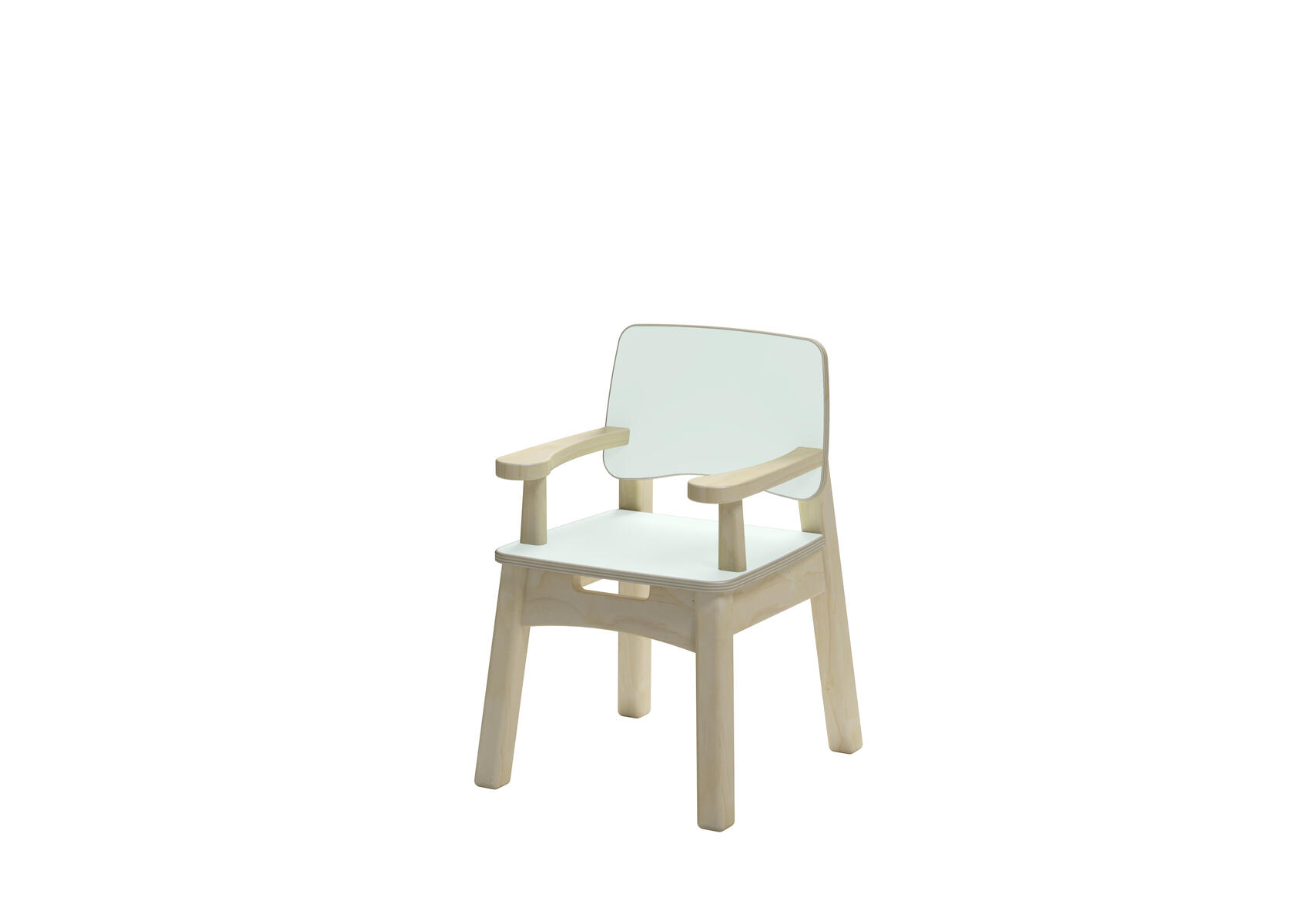 Färgkoordinerad med vårt övriga sortiment. Stativet är i vitpigmenterad björk och sits och rygg är i tåligt högtryckslaminat. Stolen är även försedd med tysta glidtassar för en lugnare miljö. Sits: B34 D28 cm. Höjd från golv till armstöd 31 cm.