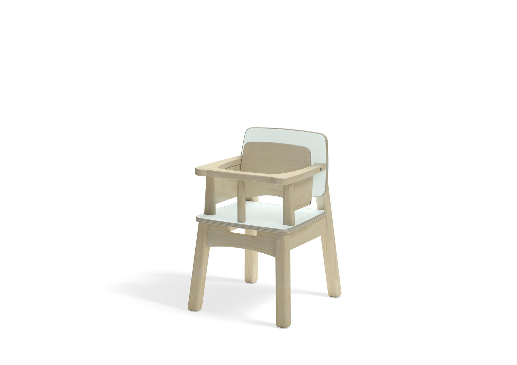 Färgkoordinerad med vårt övriga sortiment. Stativet är i vitpigmenterad björk och sits och rygg är i tåligt högtryckslaminat. Stolen är även försedd med tysta glidtassar för en lugnare miljö. Använd gärna vårt upphängningsbeslag för att underlätta städning. Sits: B34 D28 cm.