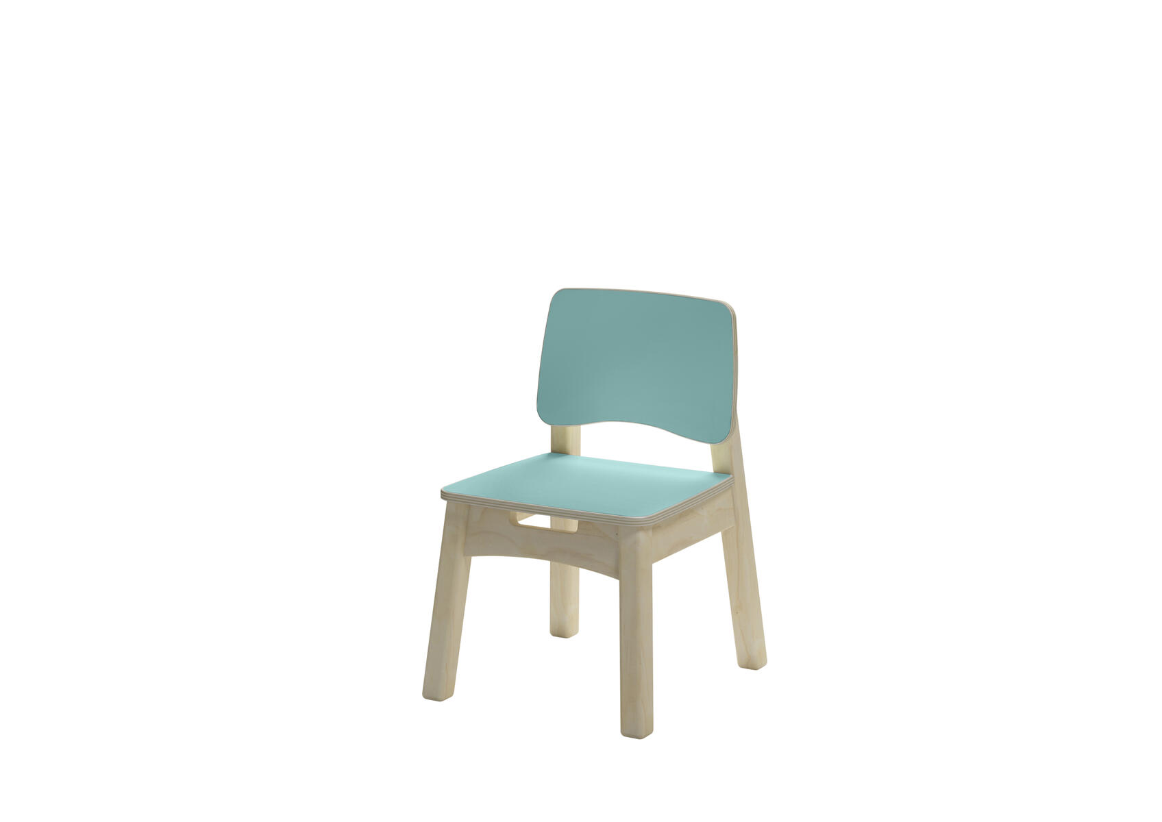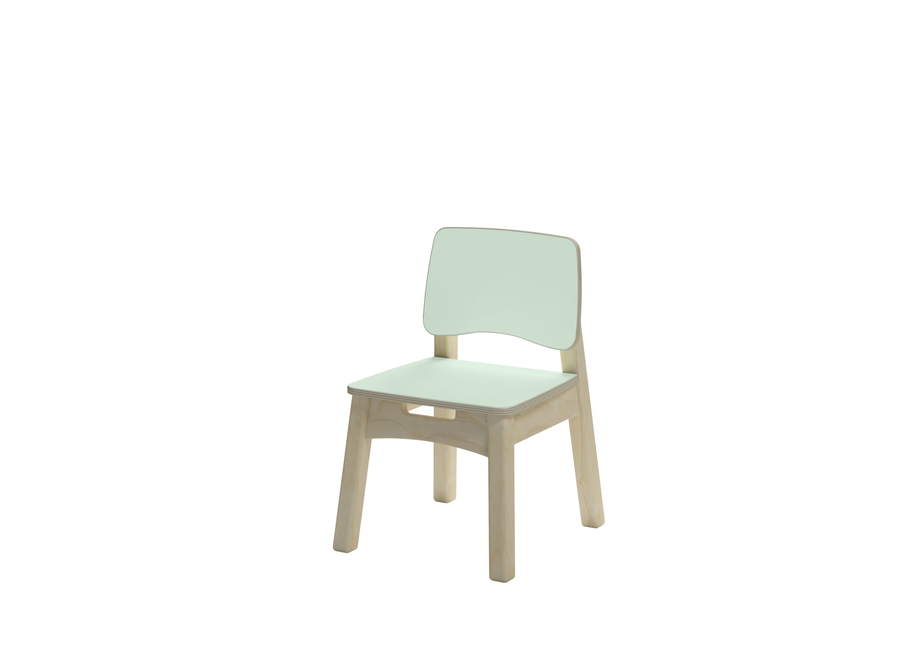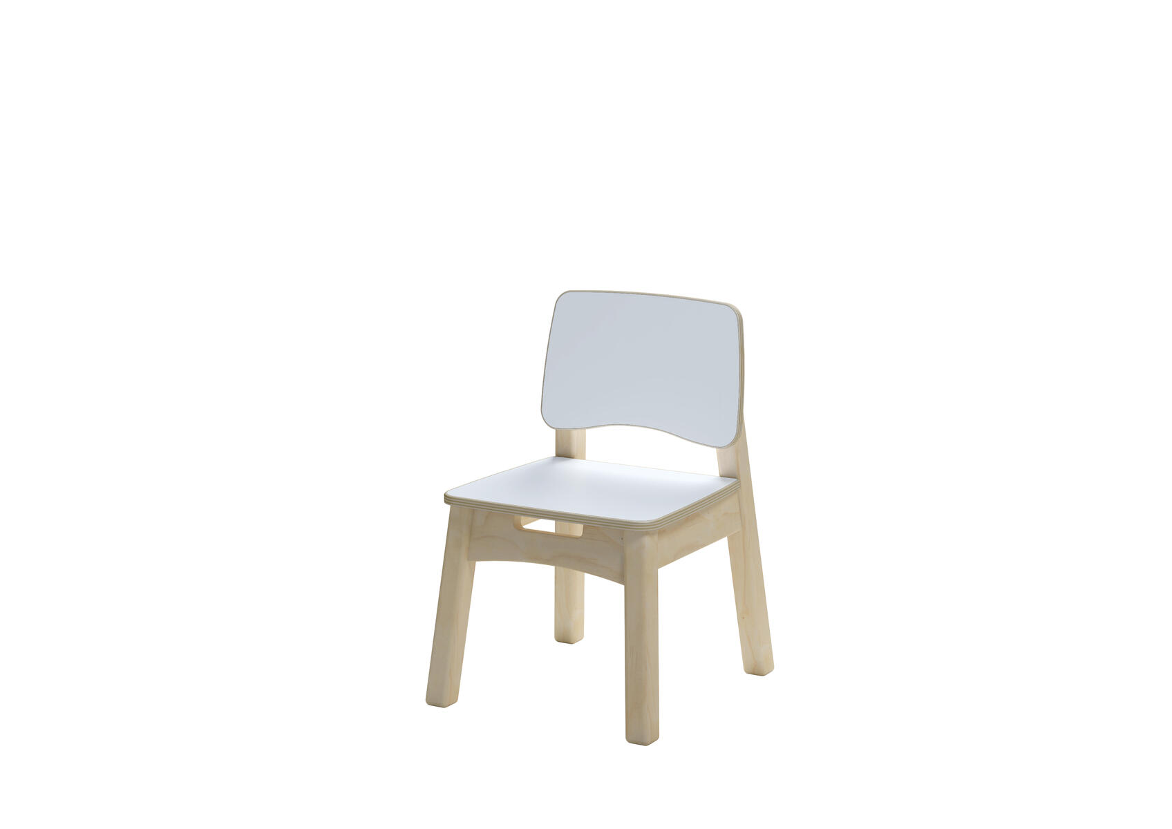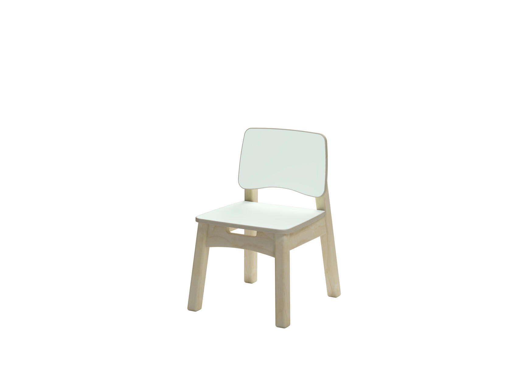 Färgkoordinerad med vårt övriga sortiment. Stativet är i vitpigmenterad björk och sits och rygg är i tåligt högtryckslaminat. Stolen är även försedd med tysta glidtassar för en lugnare miljö. Använd gärna vårt upphängningsbeslag för att underlätta städning. Sits: B34 D28 cm.