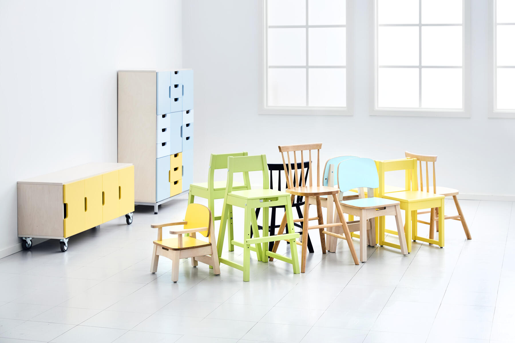Färgkoordinerad med vårt övriga sortiment. Stativet är i vitpigmenterad björk och sits och rygg är i tåligt högtryckslaminat. Stolen är även försedd med tysta glidtassar för en lugnare miljö. Sits: B34 D28 cm. Höjd från golv till armstöd 48 cm.
