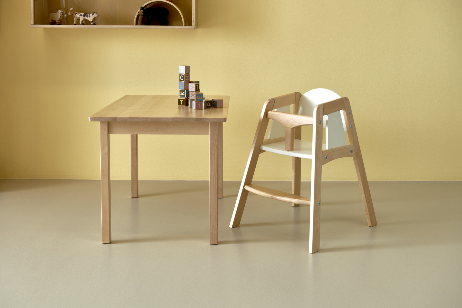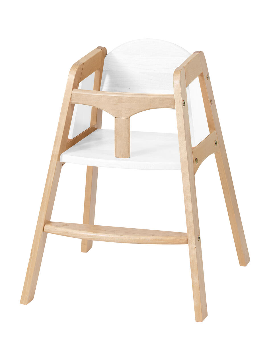 Mått: totalbredd 48 cm, sitthöjd 52 cm. Vikt 4,7 kg. Massiv björk med sits, rygg och sitsgavel förstärkt i plywood. Godkänd enligt lagstadgad säkerhetsstandard för högstolar, EN 14988. Produkten är avsedd för barn upp till 3 års ålder eller till en vikt av max 15 kg och som kan sitta själva.