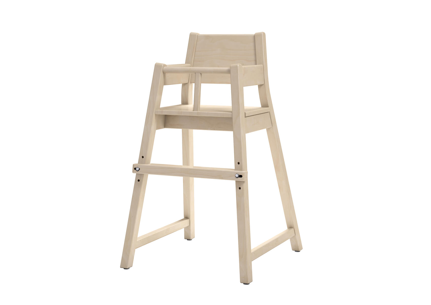 Färdigmonterad barnstol i massiv björk. Reglerbart fotstöd. Sitthöjd 53 cm. Sitsmått: B26xD21 cm. Höjd upp till bygelns överkant är 61 cm. Totalhöjd 80 cm. Vikt 5 kg. Stolen samt tillbehör är testad och godkänd enligt lagstadgad säkerhetsstandard för högstolar, EN 14988. Detta EU-krav fokuserar på stabilitet, tipprisk och hålrum. Produkten är avsedd för barn upp till 3 års ålder eller till en vikt av max 15 kg och som kan sitta själva.