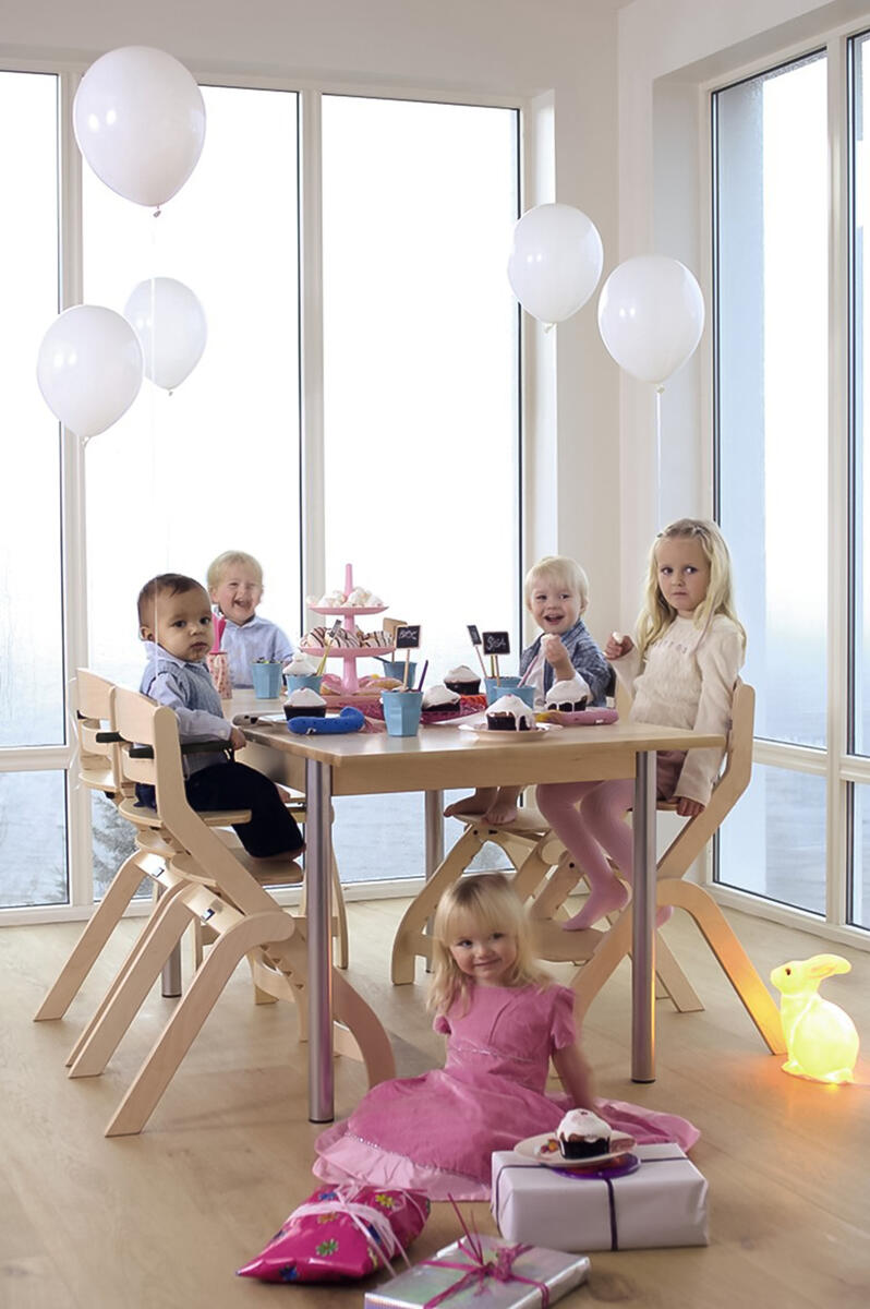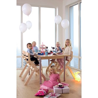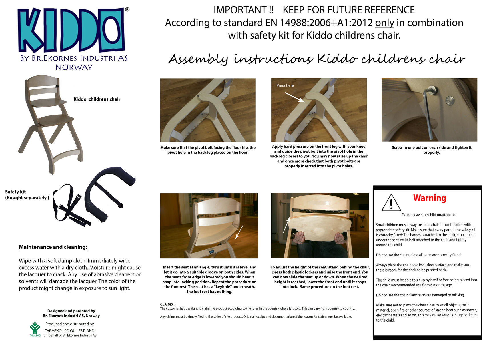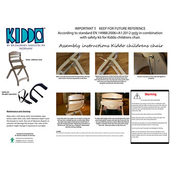 Kiddo är en stol som erbjuder en bekväm och ergonomisk sittställning oavsett ålder. Designen ger barnen en större rörelsefrihet. Fot- och sittbräda kan flyttas och justeras i både höjdled och djup så att stolen växer med barnet. Principen går ut på att skapa ett mer aktivt sittande genom att öka höftvinkeln och föra över en del av belastningen från rygg till ben. Björk, klarlackerad. Stolen samt tillbehör är testad och godkänd enligt lagstadgad säkerhetsstandard för högstolar, EN 14988. Detta EU-krav fokuserar på stabilitet, tipprisk och hålrum. Produkten är avsedd för barn upp till 8 års ålder eller till en vikt av max 60 kg och som kan sitta själva.