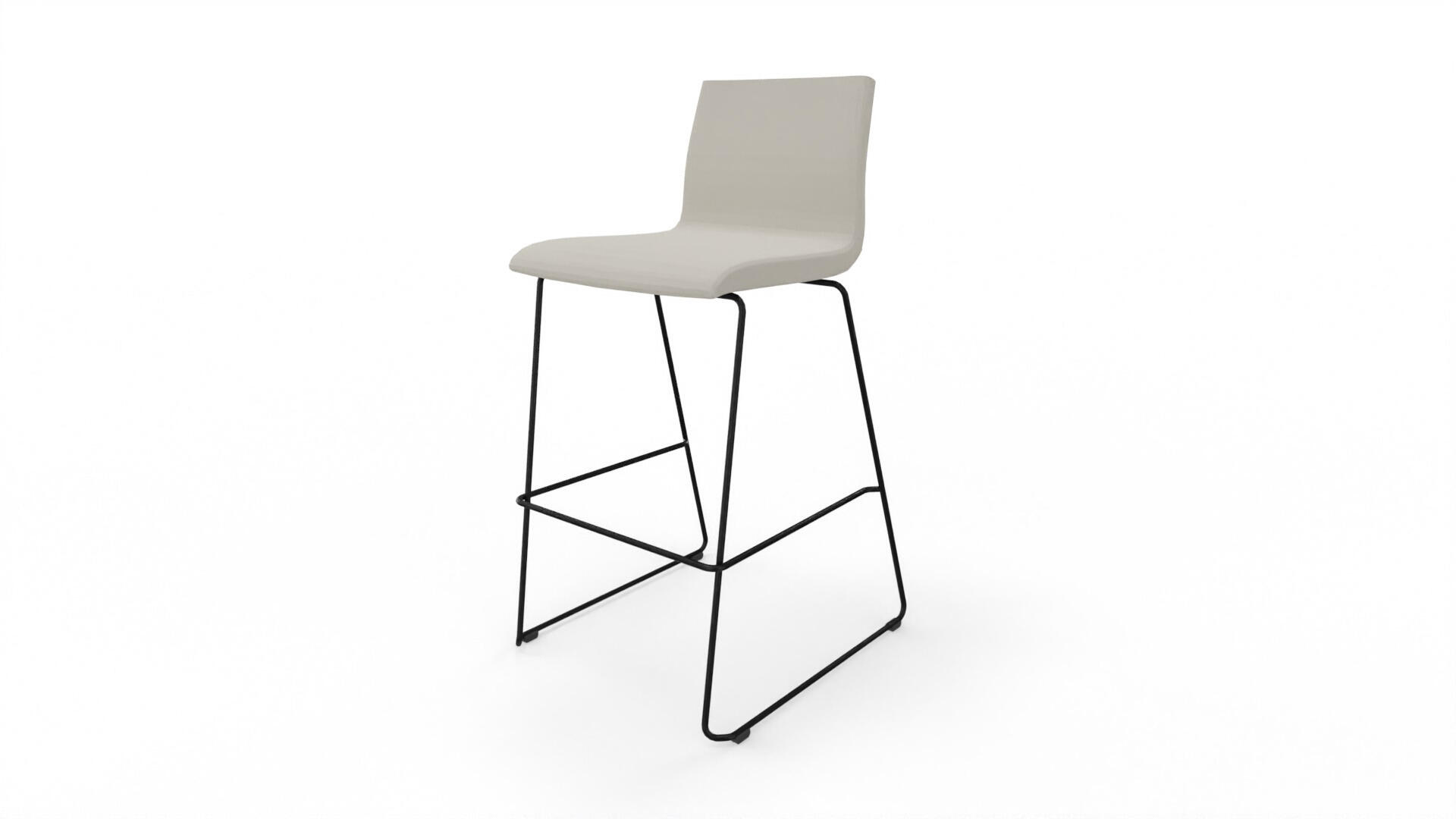 Stilren och komfortabel barstol för lunch-, konferens- och mötesrum. Den har en slät rygg och en sittdel av formpressad faner klädd med kallskum, vilket ger både komfort och stöd. Stabilt pulverlackat medstativ av ø 11 mm rör med filtbelagda möbeltassar för att skydda golvet. Stolen är stapelbar, max 5 i höjd. Fotstöd placerat 30 cm från golv.