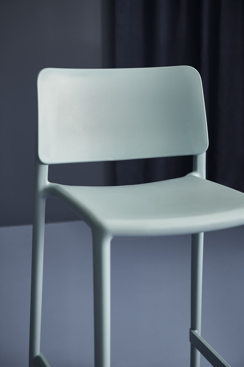 Filttass. Stapelbar. Sitthöjd 74,5 cm. Sitsmått: B38,5xD40 cm. Totalmått: B44xD47,5xH84 cm. Vikt 8,3 kg. Skal i högtryckslaminat. Stativ silverlackerat, RAL 9006.