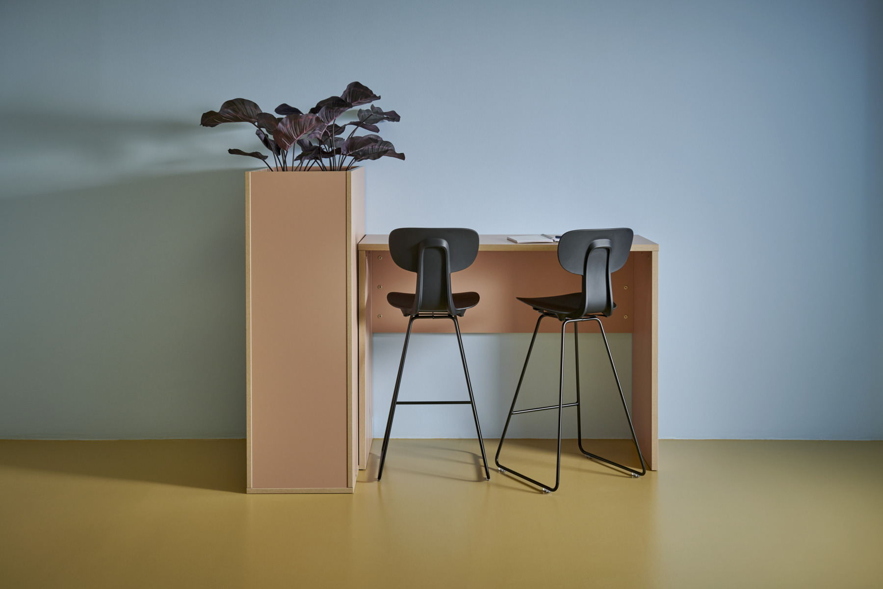 Konformat stativ med fotstöd. Skal i polyuretan. Svartlackerat stativ i RAL 9005. Möbeltass med filt.