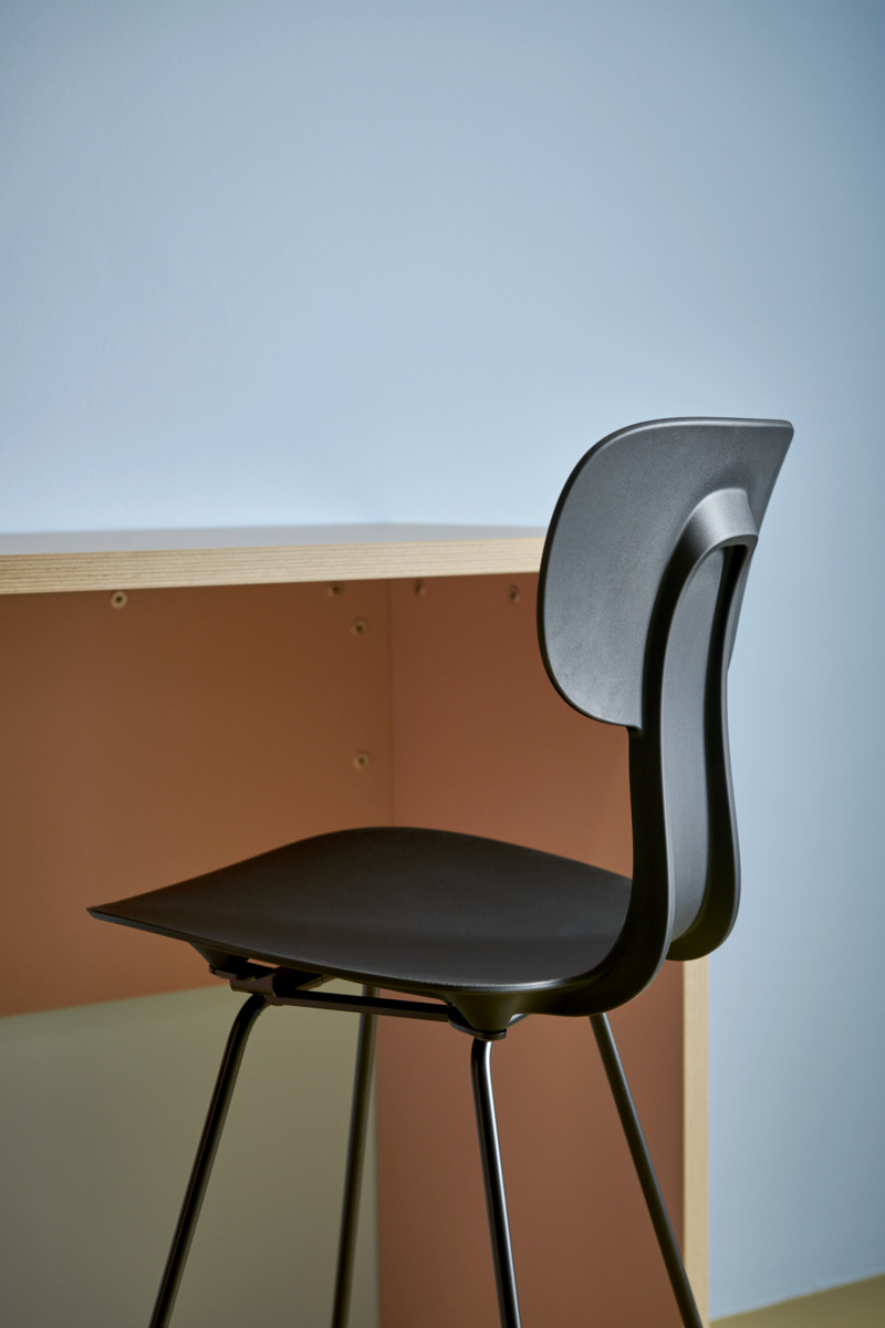 Stol som ger ett flexibelt stöd för ryggen. Lätt att rengöra. Skal i polyuretan. Svart nylonkryss med glidfötter.