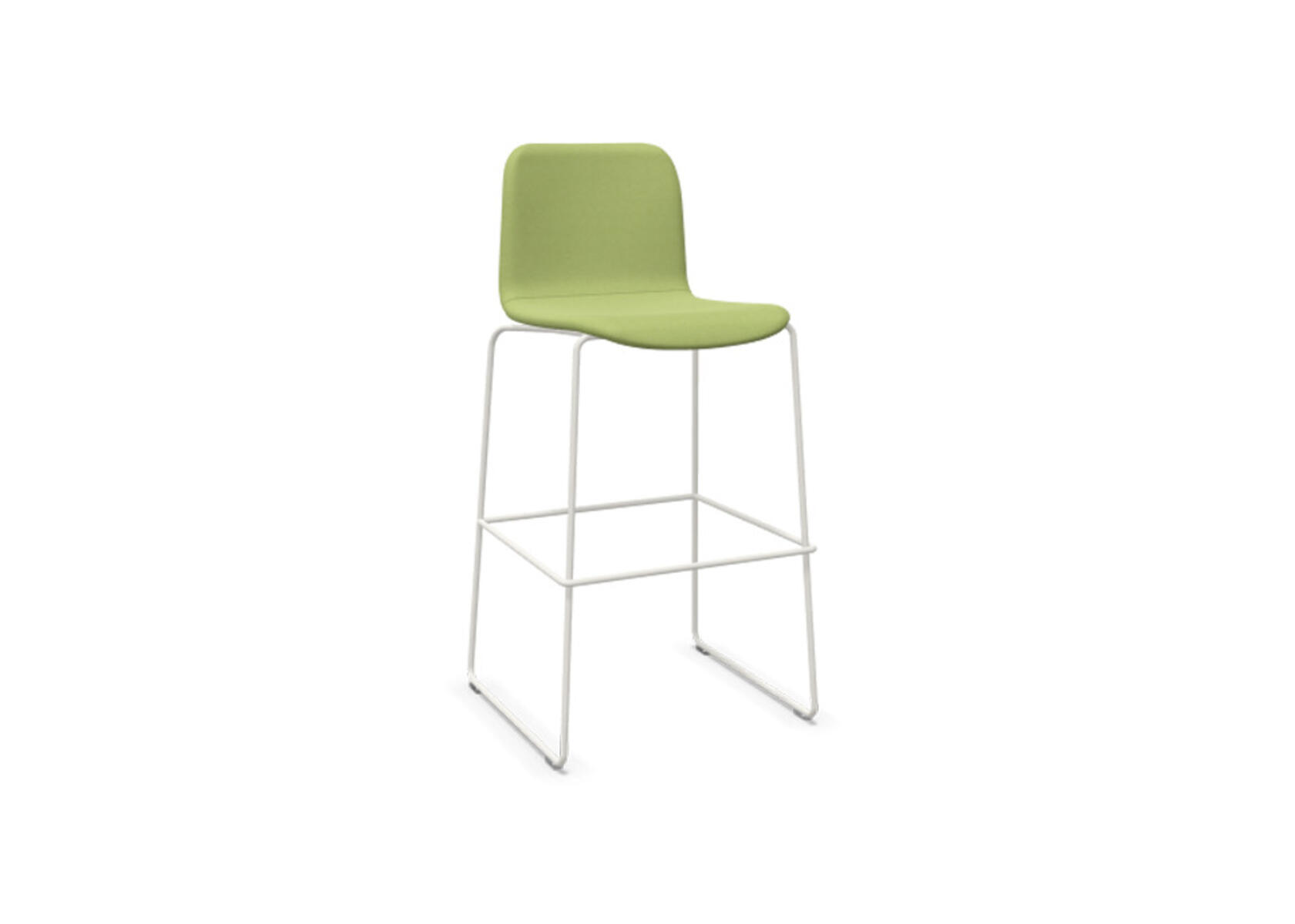 Sittskal i formpressad plywood klädd med kallskum, vilket ger både komfort och stöd. Stabilt pulverlackat stativ av ø 18 mm rör med möbeltassar för att skydda golvet. Fotstöd placerat 34 cm från golv. Maxvikt 110 kg. Stolen är ej stapelbar.
