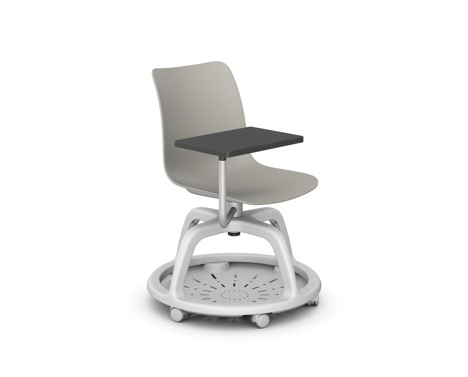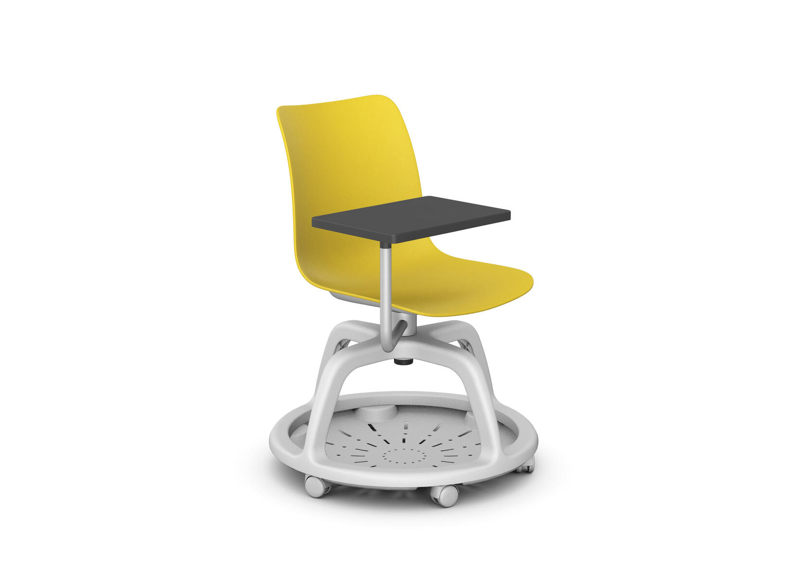 En praktisk snurrstol på hjul med praktisk skrivplatta och möjlighet till förvaring undertill. Stolen lämpar sig till konferens eller i skolan. Höjd upp till bord från golv: 68 cm. Avstånd mellan sits och skrivplatta: 23 cm.