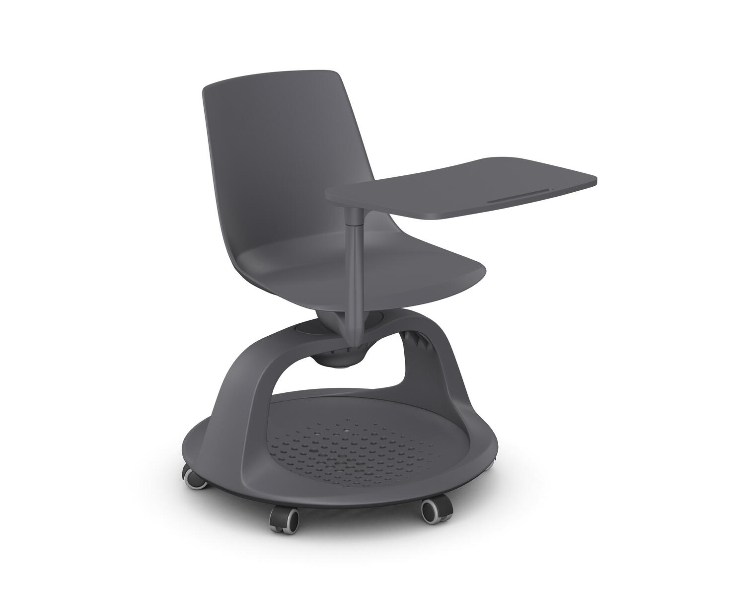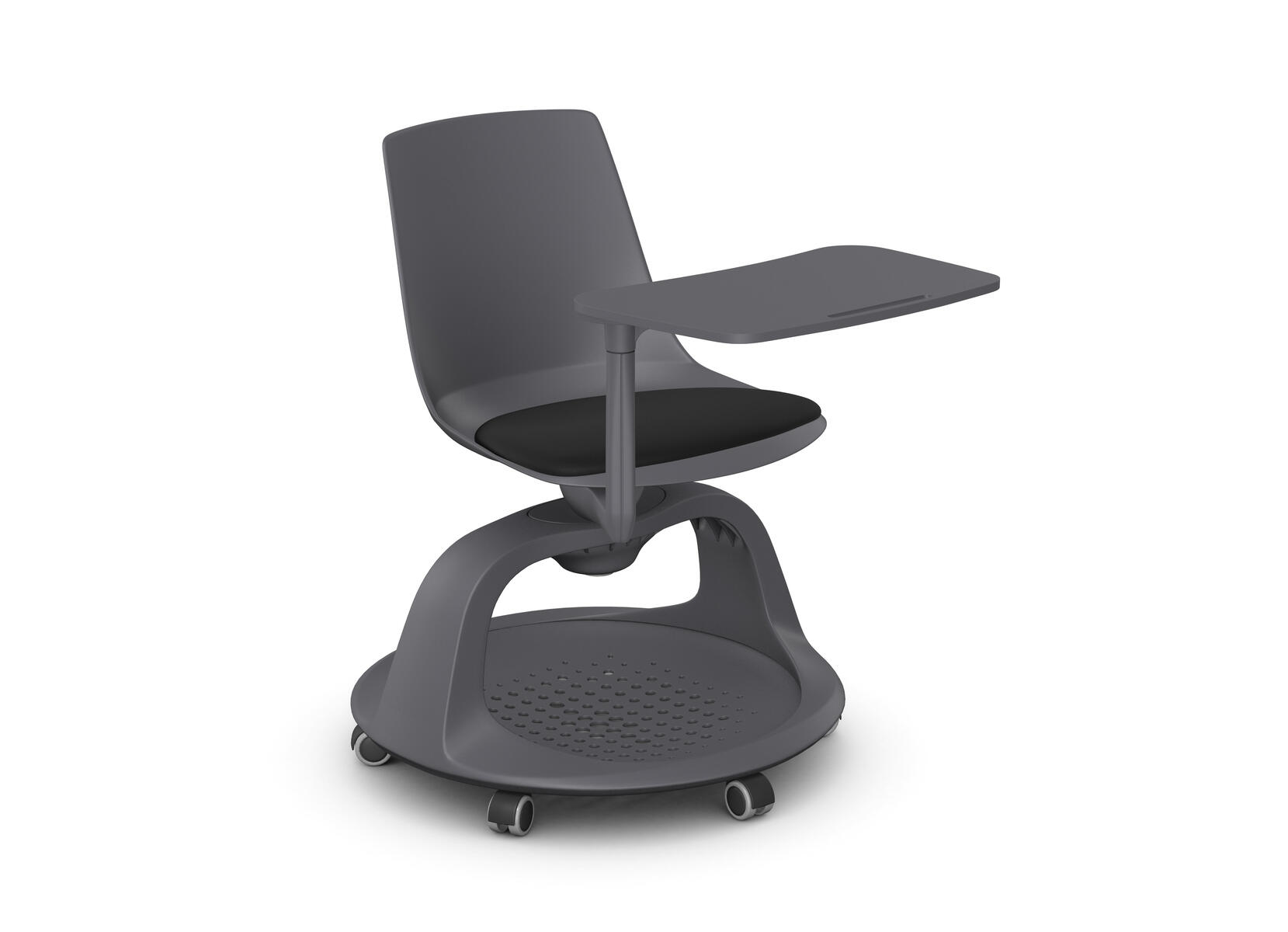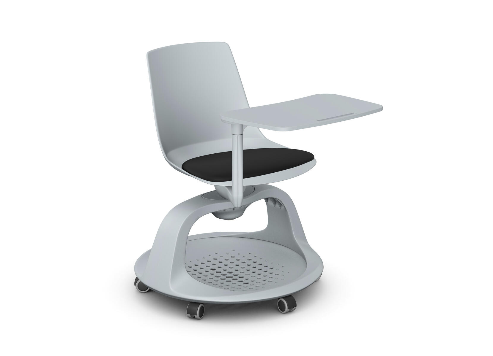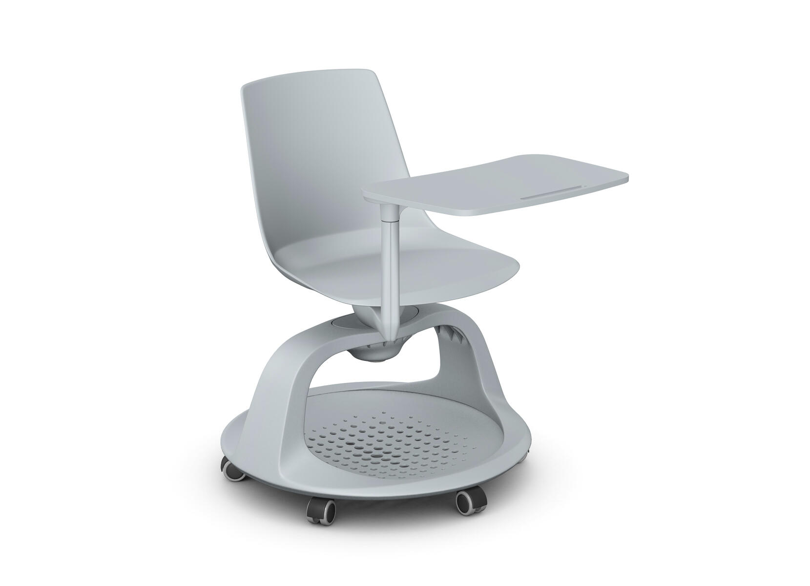 En praktisk snurrstol på hjul med praktisk skrivplatta och möjlighet till förvaring undertill. Stolen lämpar sig till konferens eller i skolan. Höjd upp till bord från golv: 68 cm. Avstånd mellan sits och skrivplatta: 23 cm.