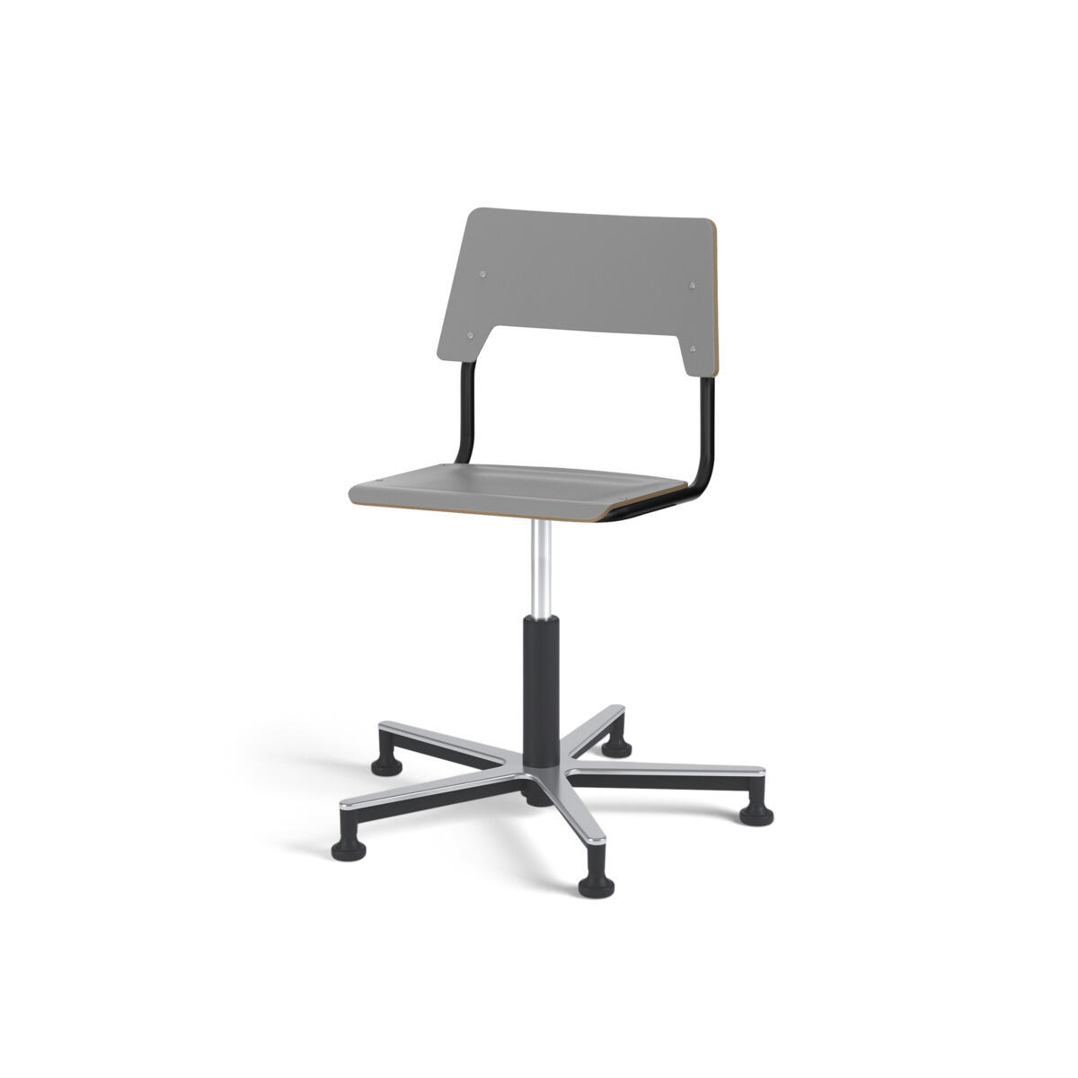 Sits och rygg är tillverkade av plywood med en yta av högtryckslaminat. Sitsen är skålad vilket gör den behaglig att sitta på. Ram för rygg och sits är lackerad i silver, RAL 9006. Utrustad med gasdämpare för reglering av sitthöjd med hjälp av en spak. Aluminiumkryss med glidfötter. En distans mellan rygg och stativ möjliggör upphängning av stolen med hjälp av ryggen. För att förhindra skador på bordet vid upphängning är glidskydd monterade på ryggen. Distansen gör det även möjligt att använda stativet som en praktisk väskkrok.