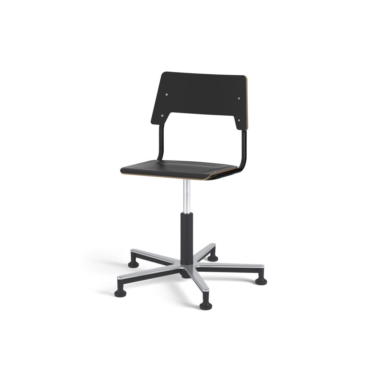 Sits och rygg är tillverkade av plywood med en yta av högtryckslaminat. Sitsen är skålad vilket gör den behaglig att sitta på. Ram för rygg och sits är lackerad i svart, RAL 9005. Utrustad med gasdämpare för reglering av sitthöjd med hjälp av en spak. Aluminiumkryss med glidfötter. En distans mellan rygg och stativ möjliggör upphängning av stolen med hjälp av ryggen. För att förhindra skador på bordet vid upphängning är glidskydd monterade på ryggen. Distansen gör det även möjligt att använda stativet som en praktisk väskkrok.