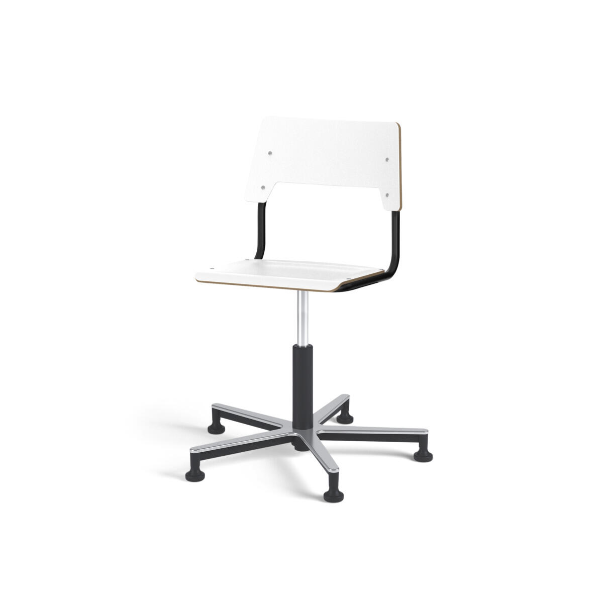 Sits och rygg är tillverkade av plywood med en yta av högtryckslaminat. Sitsen är skålad vilket gör den behaglig att sitta på. Ram för rygg och sits är lackerad i vitt, RAL 9003. Utrustad med gasdämpare för reglering av sitthöjd med hjälp av en spak. Aluminiumkryss med glidfötter. En distans mellan rygg och stativ möjliggör upphängning av stolen med hjälp av ryggen. För att förhindra skador på bordet vid upphängning är glidskydd monterade på ryggen. Distansen gör det även möjligt att använda stativet som en praktisk väskkrok.