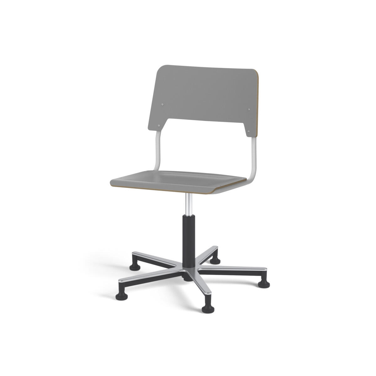 Sits och rygg är tillverkade av plywood med en yta av högtryckslaminat. Sitsen är skålad vilket gör den behaglig att sitta på. Ram för rygg och sits är lackerad i silver, RAL 9006. Utrustad med gasdämpare för reglering av sitthöjd med hjälp av en spak. Aluminiumkryss med glidfötter. En distans mellan rygg och stativ möjliggör upphängning av stolen med hjälp av ryggen. För att förhindra skador på bordet vid upphängning är glidskydd monterade på ryggen. Distansen gör det även möjligt att använda stativet som en praktisk väskkrok.