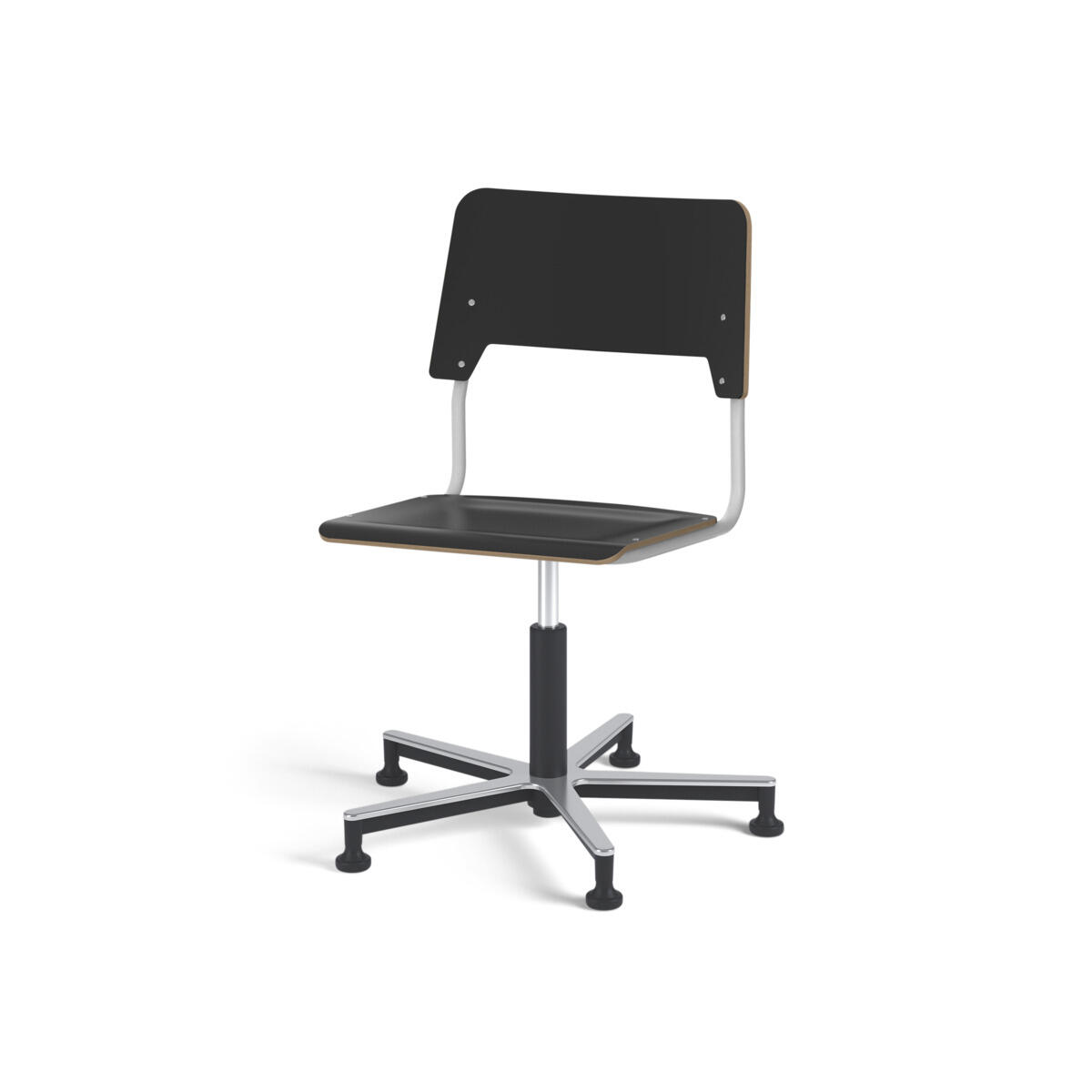 Sits och rygg är tillverkade av plywood med en yta av högtryckslaminat. Sitsen är skålad vilket gör den behaglig att sitta på. Ram för rygg och sits är lackerad i svart, RAL 9005. Utrustad med gasdämpare för reglering av sitthöjd med hjälp av en spak. Aluminiumkryss med glidfötter. En distans mellan rygg och stativ möjliggör upphängning av stolen med hjälp av ryggen. För att förhindra skador på bordet vid upphängning är glidskydd monterade på ryggen. Distansen gör det även möjligt att använda stativet som en praktisk väskkrok.