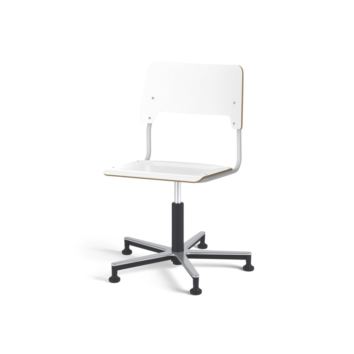 Sits och rygg är tillverkade av plywood med en yta av högtryckslaminat. Sitsen är skålad vilket gör den behaglig att sitta på. Ram för rygg och sits är lackerad i vitt, RAL 9003. Utrustad med gasdämpare för reglering av sitthöjd med hjälp av en spak. Aluminiumkryss med glidfötter. En distans mellan rygg och stativ möjliggör upphängning av stolen med hjälp av ryggen. För att förhindra skador på bordet vid upphängning är glidskydd monterade på ryggen. Distansen gör det även möjligt att använda stativet som en praktisk väskkrok.