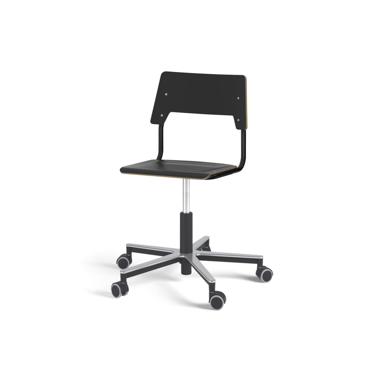 Sits och rygg är tillverkade av plywood med en yta av högtryckslaminat. Sitsen är skålad vilket gör den behaglig att sitta på. Ram för rygg och sits är lackerad i svart, RAL 9005. Utrustad med gasdämpare för reglering av sitthöjd med hjälp av en spak. Aluminiumkryss med hjul. En distans mellan rygg och stativ möjliggör upphängning av stolen med hjälp av ryggen. För att förhindra skador på bordet vid upphängning är glidskydd monterade på ryggen. Distansen gör det även möjligt att använda stativet som en praktisk väskkrok.