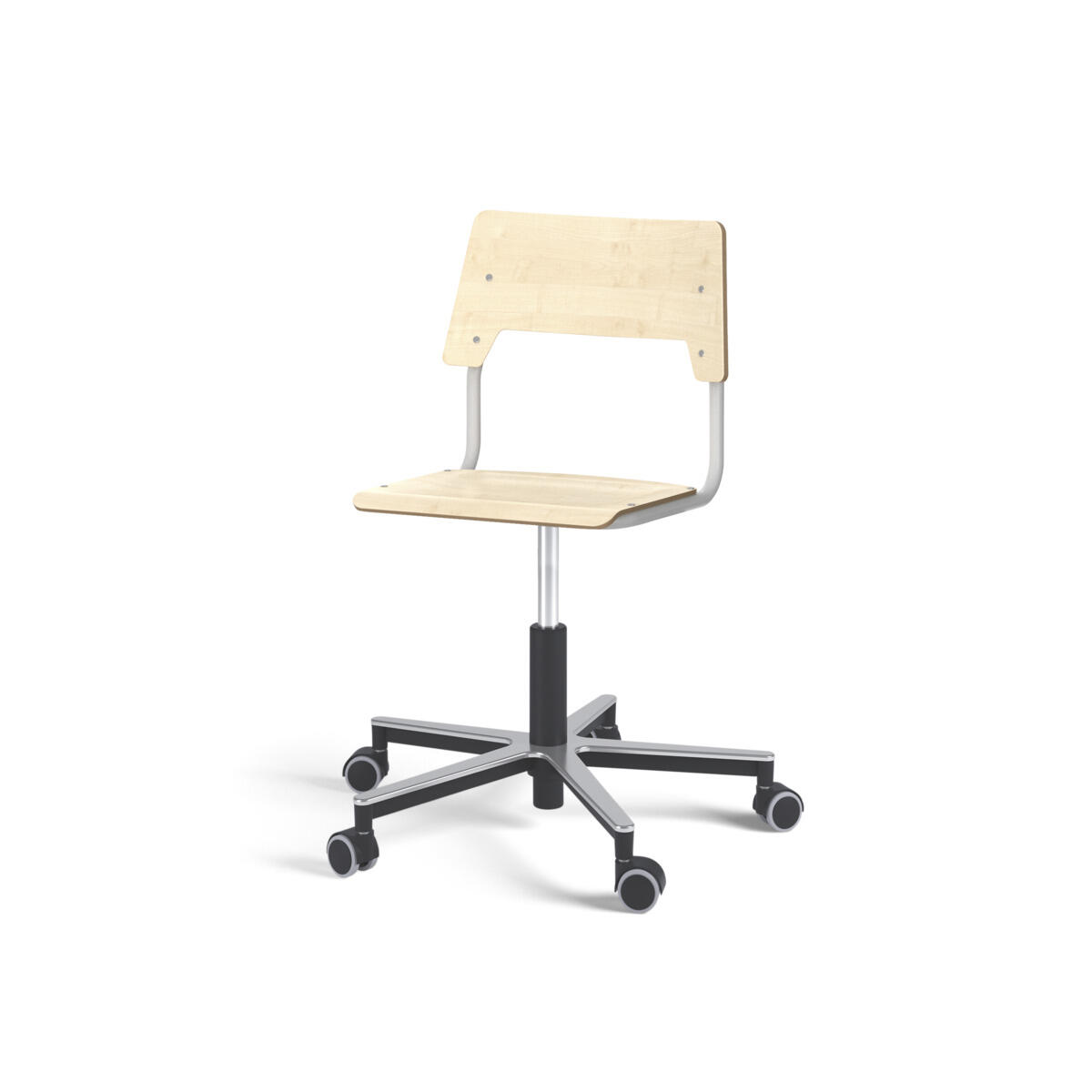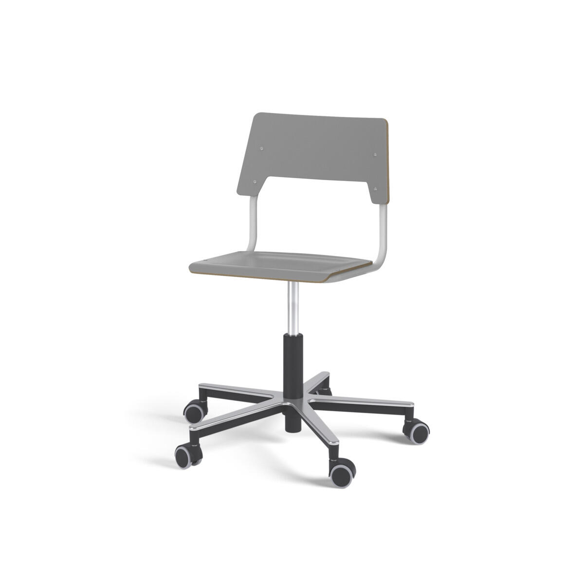 Sits och rygg är tillverkade av plywood med en yta av högtryckslaminat. Sitsen är skålad vilket gör den behaglig att sitta på. Ram för rygg och sits är lackerad i silver, RAL 9006. Utrustad med gasdämpare för reglering av sitthöjd med hjälp av en spak. Aluminiumkryss med hjul. En distans mellan rygg och stativ möjliggör upphängning av stolen med hjälp av ryggen. För att förhindra skador på bordet vid upphängning är glidskydd monterade på ryggen. Distansen gör det även möjligt att använda stativet som en praktisk väskkrok.
