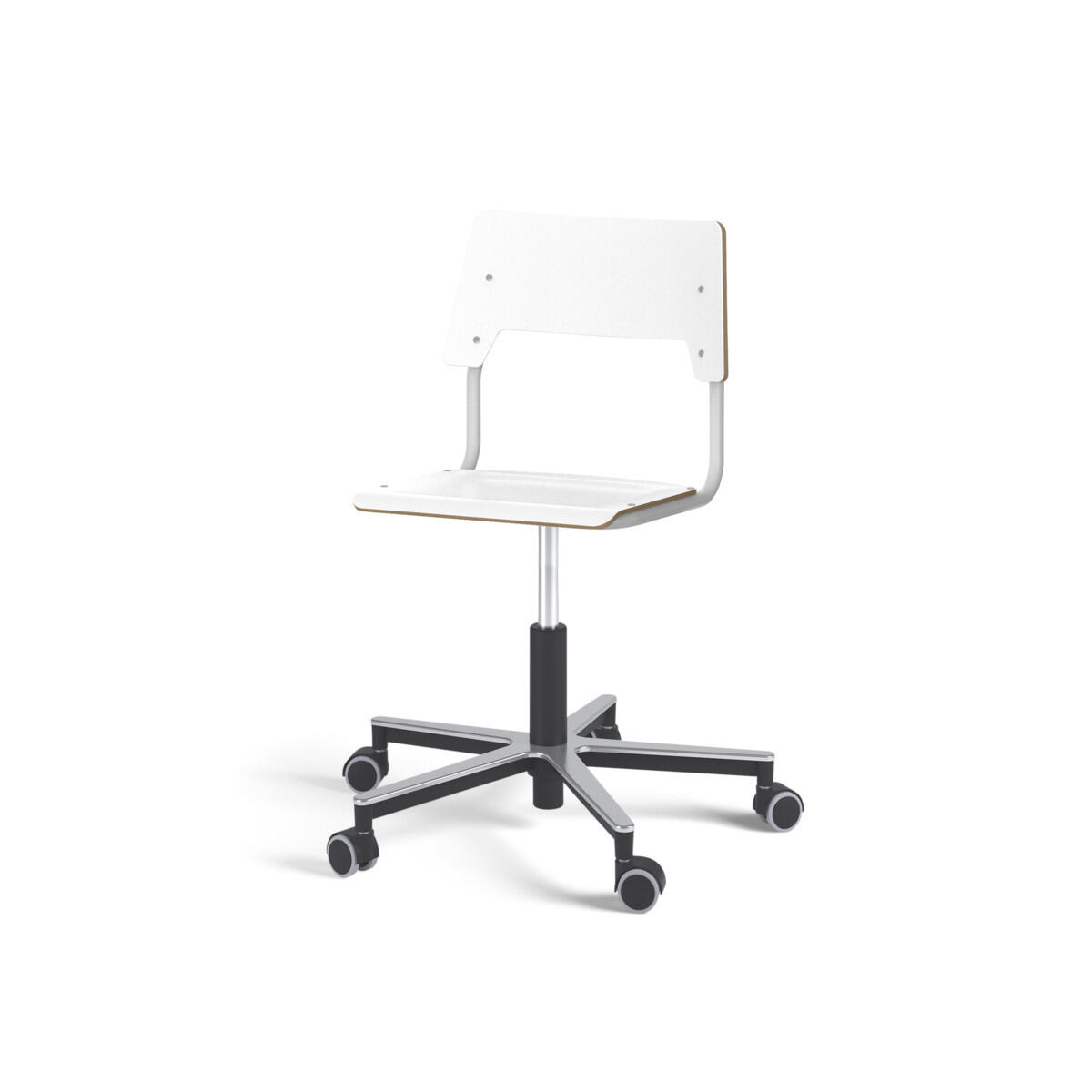 Sits och rygg är tillverkade av plywood med en yta av högtryckslaminat. Sitsen är skålad vilket gör den behaglig att sitta på. Ram för rygg och sits är lackerad i vitt, RAL 9003. Utrustad med gasdämpare för reglering av sitthöjd med hjälp av en spak. Aluminiumkryss med hjul. En distans mellan rygg och stativ möjliggör upphängning av stolen med hjälp av ryggen. För att förhindra skador på bordet vid upphängning är glidskydd monterade på ryggen. Distansen gör det även möjligt att använda stativet som en praktisk väskkrok.