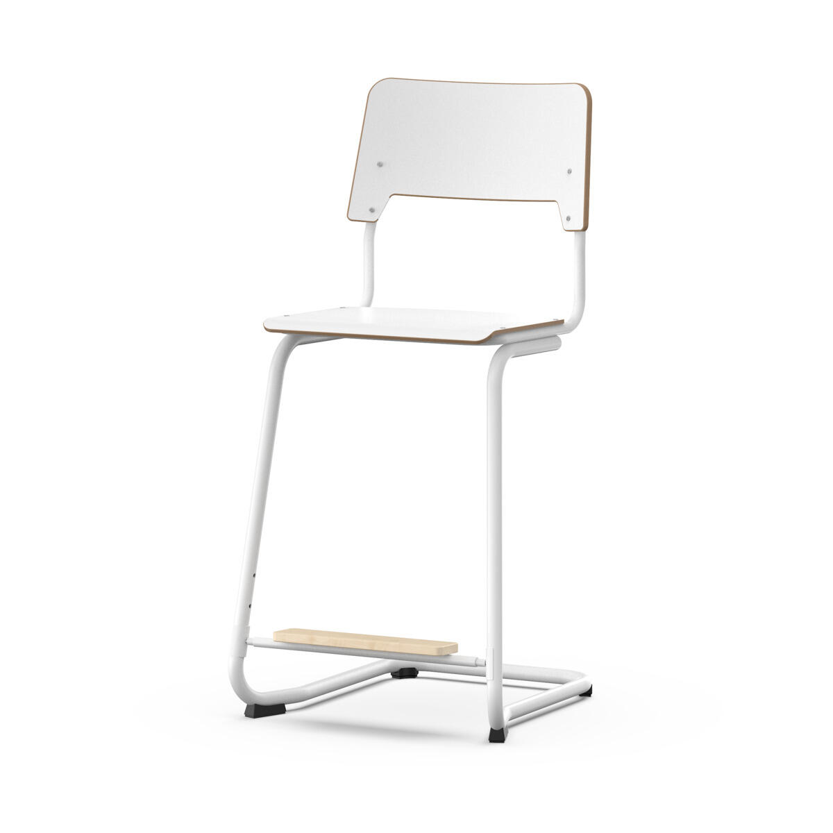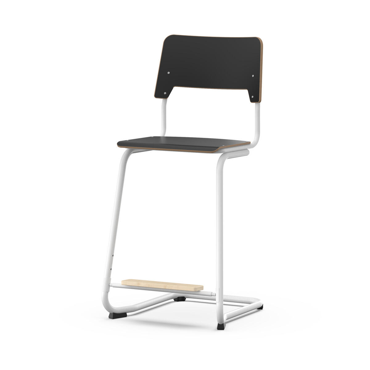 Sits och rygg är tillverkade av plywood med en yta av högtryckslaminat. Sitsen är skålad vilket gör den behaglig att sitta på. Stativet är lackerat i vitt, RAL 9003. Tassar med filt. Stolen uppfyller kraven enligt EN 1729-1 & 2. En distans mellan rygg och stativ möjliggör upphängning av stolen med hjälp av ryggen. För att förhindra skador på bordet vid upphängning är glidskydd monterade på ryggen. Distansen gör det även möjligt att använda stativet som en praktisk väskkrok. Reglarbart fotstöd i tre fasta lägen (26, 31 och 36 cm från sits).