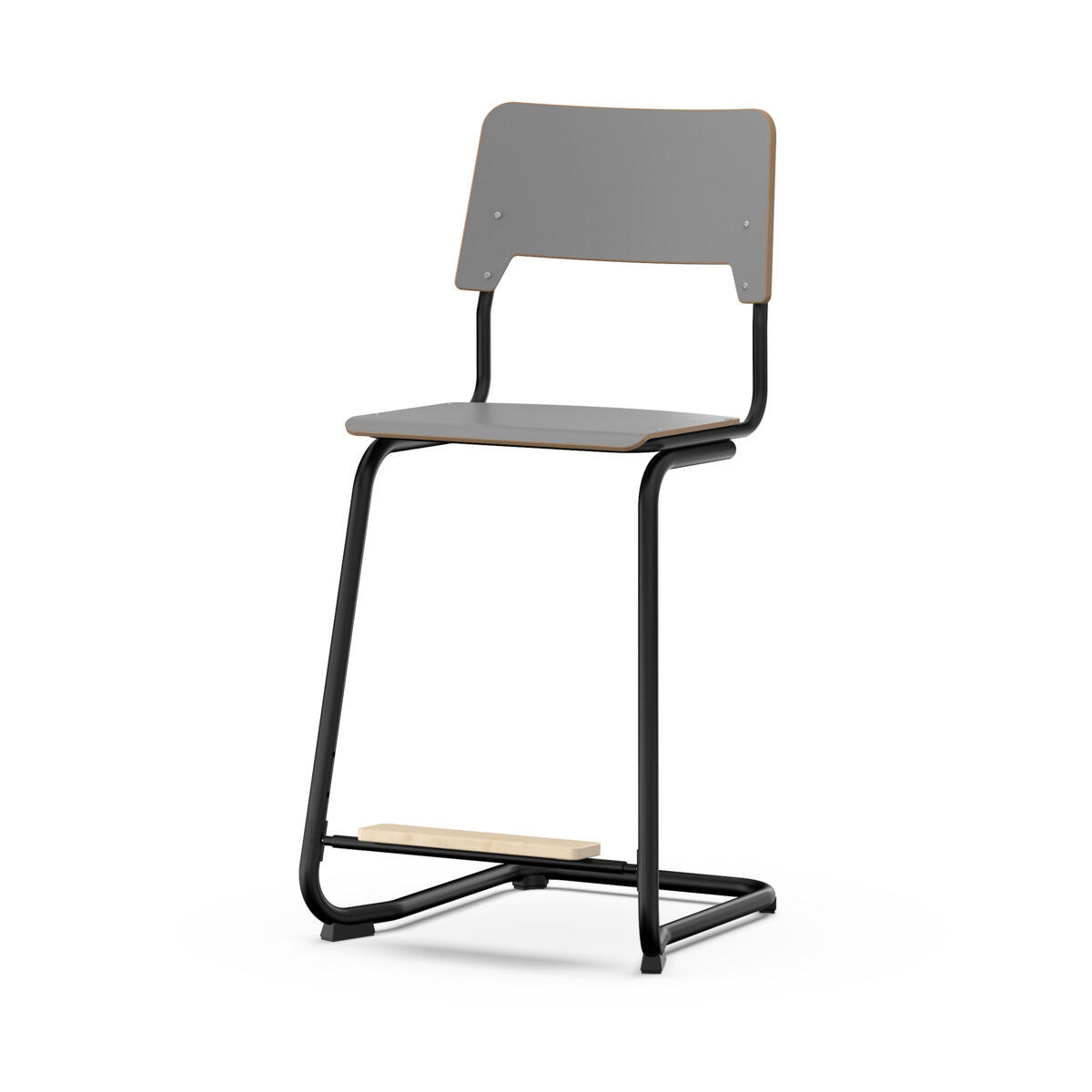 Sits och rygg är tillverkade av plywood med en yta av högtryckslaminat. Sitsen är skålad vilket gör den behaglig att sitta på. Stativet är lackerat i svart, RAL 9005. Tassar med filt. Stolen uppfyller kraven enligt EN 1729-1 & 2. En distans mellan rygg och stativ möjliggör upphängning av stolen med hjälp av ryggen. För att förhindra skador på bordet vid upphängning är glidskydd monterade på ryggen. Distansen gör det även möjligt att använda stativet som en praktisk väskkrok. Reglarbart fotstöd i tre fasta lägen (26, 31 och 36 cm från sits).