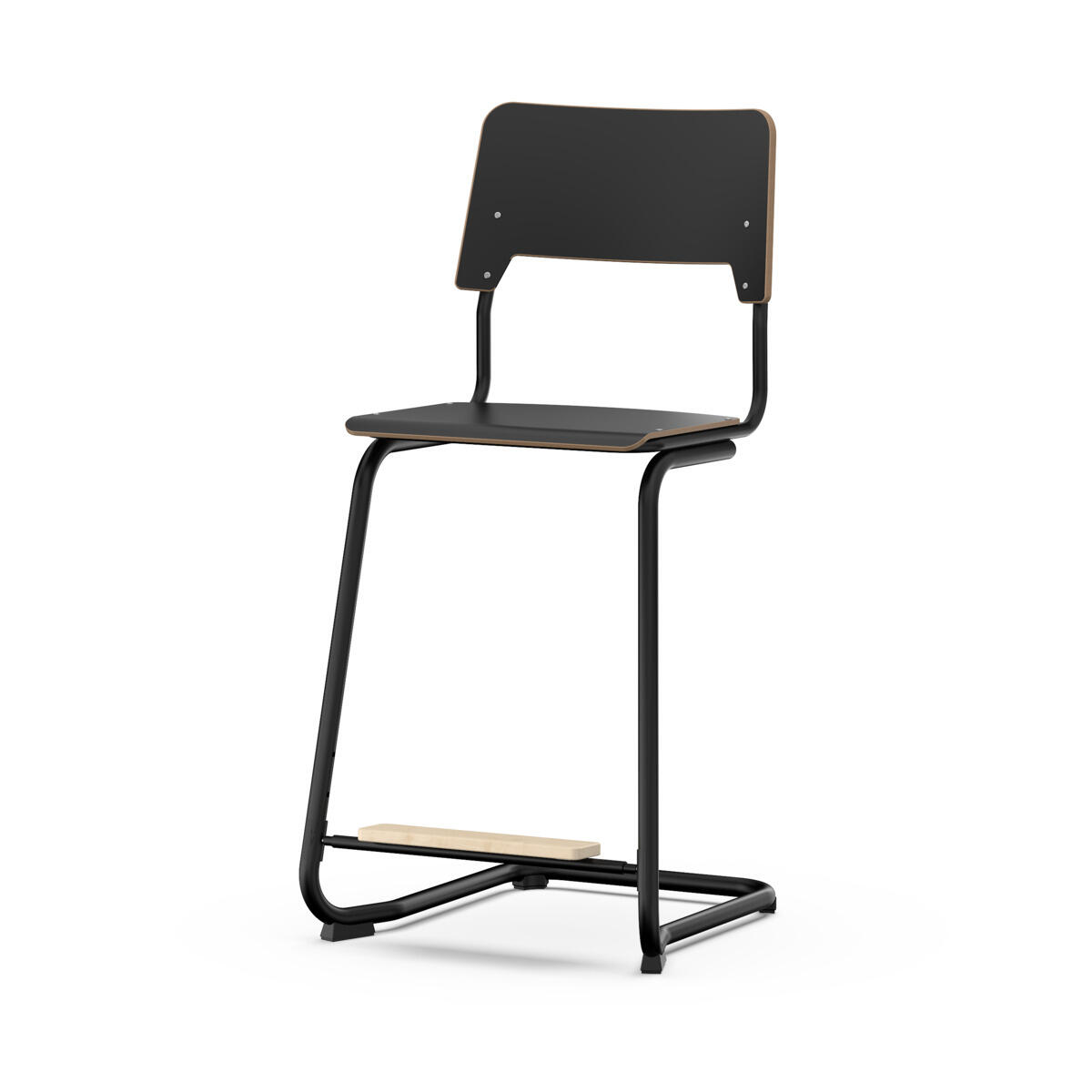 Sits och rygg är tillverkade av plywood med en yta av högtryckslaminat. Sitsen är skålad vilket gör den behaglig att sitta på. Stativet är lackerat i svart, RAL 9005. Reglerbart fotstöd i tre fasta lägen. Tassar med filt. Stolen uppfyller kraven enligt EN 1729-2. Stapelbar. En distans mellan rygg och stativ möjliggör upphängning av stolen med hjälp av ryggen. För att förhindra skador på bordet vid upphängning är glidskydd monterade på ryggen. Distansen gör det även möjligt att använda stativet som en praktisk väskkrok.